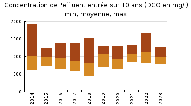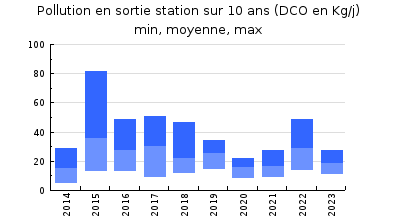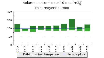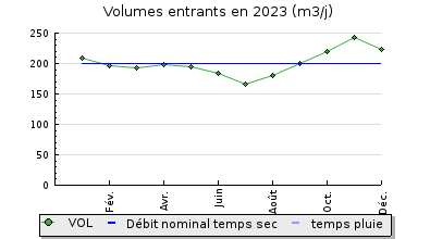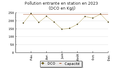 | Système de collecte : Le débit collecté est sensible aux conditions météo, en particulier à la pluviométrie (peu de ressuyage). La capacité est alors très ponctuellement dépassée. La station est en moyenne aux 2/3 de sa capacité. Des surcharges hydrauliques sont notées, rarement très élevées (il n¿y en a pas eu en 2022, année particulièrement sèche) et assez peu fréquentes (moins de 20 fois par an). |