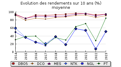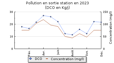 | DBO5 | 68 Kg/j | 56 % | 339 mg/l | 95 % | 3,5 Kg/j | 14 mg/l |