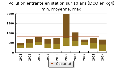 | Station d'épuration : Traitement : Le dégrilleur-escalier est fonctionnel. Un nettoyage de l'ouvrage, de la plateforme, des conduites de refoulement et des abords en contrebas serait à assurer dès lors que des débordements d'eaux usées se produisent (traces anciennes visibles). En fin d¿année, il a été préconisé de vérifier le bon fonctionnement du dégraisseur (aéroflot et racleur de surface). L¿efficacité de l¿équipement ne semble pas optimale. La corrosion du moteur de l¿aérateur est également prononcée. Au niveau du bassin tampon, les hydroéjecteurs ont subi des dysfonctionnements (n°1 en panne jusqu¿à début décembre / n°2 hors service depuis le 26/09). L¿état du génie civil est à surveiller (coulures visibles à différents endroits). La bâche souple pouvant recueillir une portion des surverses du bassin tampon est restée inutilisable du 04/06 au 27/08, en raison de la panne du compresseur pilotant la vanne d¿alimentation. Les deux bassins biologiques ORGANICA sont pilotés via un automate, les différentes phases du traitement (alimentation, réaction, décantation, vidange, extraction) étant régulées par horloge avec un couplage avec des sondes de niveau. Après le changement au cours du premier semestre 2024 de la pompe d'extraction au niveau du bassin Organica n°2, avec un débit plus faible que la précédente (6,4 m3/h au lieu de 56 m3/h), c'est la pompe d'extraction au niveau du bassin Organica n°1 qui a été changée le 03/12 (même caractéristique que la pompe n°2). Cela entraîne des temps d'extraction plus long qu'auparavant (une trentaine de minutes dorénavant au lieu de 4 à 5 minutes auparavant). Dans l'Organica n°1, l'agitateur a également été renouvelé (le 13/11). Au niveau de la serre, les automatismes d¿aspersion des végétaux, d¿ouverture/fermeture des vitres ne sont pas fonctionnels. En raison de portions de tissus abîmées ou déchirées, les mécanismes d¿ouverture/fermeture des rideaux ne peuvent de toute façon plus être utilisés. Le bâti métallique de la serre reste très corrodé. Des débordements de boues en surface de certains casiers végétalisés sont toujours observés. Lors de la visite SATESE du mois de juillet, il avait été constaté un défaut de régulation du débit rejeté, ce qui provoquait une mise en charge du chenal de mesure et du poste eaux traitées en aval, et s¿accompagnait de pertes de boues. L¿exploitant a par la suite corrigé ce défaut (réglage de la vanne présente en amont du chenal pour un débit maximum instantané de 100 m3/h). En décembre, l¿exploitant indique des défauts récurrents d¿alimentation électrique de l¿automate qui ont conduit à des by-pass d¿effluents bruts au niveau du point A5 (trop-plein bassin tampon). Qualité du rejet / Observations sur les charges polluantes : D'après l'autosurveillance 2024, en ne considérant que le point A4 correspondant aux rejet des eaux traitées, la qualité du rejet reste globalement médiocre, à cause de pertes de boues régulières, qui peuvent être importantes et entraîner alors des dépassements des normes en vigueur (MES et paramètres organiques). Les rendements épuratoires associés sont aussi médiocres, n¿atteignant pas les valeurs minimales imposées. L'épuration des paramètres azotés, sans normes de rejet particulières, est acceptable jusqu¿en septembre, puis la nitrification devient médiocre, impliquant des valeurs élevées en NTK. Il serait intéressant d¿identifier les raisons de cette moins bonne épuration (changement de réglages ? taux de boues inadaptés dans les bassins ?). Pour rappel, il n¿y a pas de traitement spécifique du phosphore sur la station, et les concentrations mesurées sont très disparates (de 0,6 à 9,3 g/l). En outre, en 2024, la qualité globale du rejet est impactée par les surverses d¿effluents bruts au niveau du point A5 (trop-plein du bassin tampon) : cela accentue donc les mauvais résultats. A noter des concentrations atypiques lors du bilan du 17/12 : la DCO paraît très élevée au regard des autres paramètres (583 mg/l), même si les |