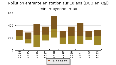 Système de collecte : La station n'est pas en surcharge hydraulique. Des surdébits sont notés, mais modérés ces deux dernières années, avec des nombres de jour de dépassement de la capacité plutôt réduits. |