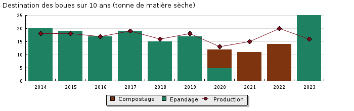 | Sous produits : Epaississement statique en amont du le silo de stockage. Production théorique : La production théorique attendue est estimée à environ 18 tonnes de matières sèches (TMS) par an. 1120 EH × 16 kg/MS/EH = 17,9 tonnes de MS/an. Production réelle : En 2023, 936 m3 à 18,6 g/l soit 17,41 TMS ont été produit, La production réelle correspond à la production théorique. Filière d'élimination : En 2023, cinq opérations dévacuations des boues ont eu lieux. Deux campagnes dépandages agricoles. Trois campagnes de déshydratation mobile ont été réalisées afin dévacuer les boues en centre de compostage. Quantité évacuée : Le tonnage de boues déshydratées et mises en compostage est de 67,84 TMB à 18,03 % soit 12,21 TMS réceptionnées. Le tonnage de boues évacuées en épandage est de 308 m3 à 1,9 % soit 5,7 TMS. |