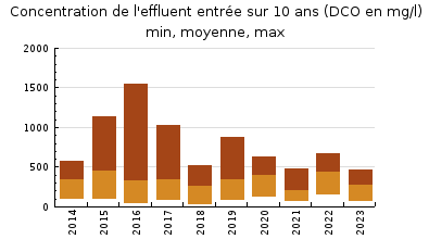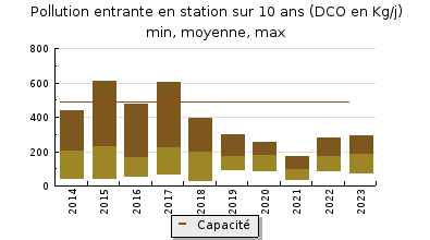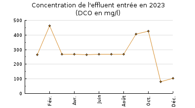 | Station d'épuration : En fin dannée 2023, le déversoir dorage a été déplacé sur le poste de relevage. Il est équipé dune sonde US afin de comptabiliser le volume déversé par le trop plein du poste. Le dispositif sera opérationnel dès 2024. Remplissage : Le volume journalier moyen reçu est de 730 m3 ce qui correspond à 4 866 EH soit 119 % de la capacité nominale de la station et la charge organique moyenne représente 1120 EH en DBO5 soit 27 % de la capacité nominale de la station. Afin de réduire les déversements deaux non traitées, lexploitant a ajusté le réglage du limiteur de fonctionnement du poste de relevage de façon à optimiser le remplissage aux environs de 1 200 m3/j à 1 300 m3/j. La charge organique moyenne mesurée en 2023 en provenance de l'agglomération représente 1014 EH, soit un peu plus de 24 % de la charge entrante mesurée. Entretien : Les abords de la station sont propres et entretenus. Fonctionnement : La station assure une qualité de traitement satisfaisante. La qualité du rejet respecte les performances attendues. Une sonde de turbidité a été mise en place en fin d'année 2017 dans le canal de sortie avec une alarme au-delà de 20 NTU. Un dégrilleur automatique a été mis en place en 2021. La mesure de débit est satisfaisante car on constate un écart faible en 2023 entre les volumes journaliers comptabilisés en entrée et en sortie (2,8 %). Un déversoir dorage et une sonde US ont été installé en décembre 2023 dans le poste de relevage afin de comptabiliser les volumes by-passé. Autosurveillance : Les 12 mesures d'autosurveillance annuelles respectent les exigences règlementaires et les performances attendues. Au cours de lannée 2023, un pic a été mesuré le 23/01 avec une concentration en DCO de 1560 mg/l sur larrivée industrielle. Il est conseillé de surveiller la qualité des déversements de la laiterie. Impact visible sur le milieu récepteur : Néant Usages sensibles en aval du système d'assainissement : En ce qui concerne les eaux souterraines, le système d'assainissement se situe sur les périmètres de protection rapprochée des captages de la LAITERIE, de la COURTILLE et de CABOUY. En cas de dysfonctionnement, le risque d'impact sur cet usage est significatif. |
