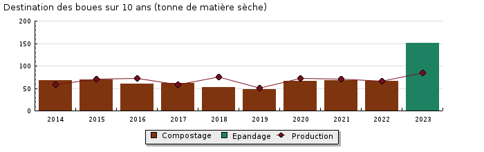 | Sous produits : Production théorique : Production théorique de boues hors dépotage et réactifs : 2472 EH x 16,6 kg MS/EH/an = 41 tonnes de matières sèches (TMS), soit pour une siccité de 20,8%, 197 tonnes de produit brut. Le volume dépoté de matières de vidange sur l'année 2023 nest pas connu. Pour rappel, il sagit là dune donnée réglementaire à transmettre. Historiquement, en moyenne, 220 m3 de matières de vidange sont dépotées sur cette station soit 220 x 35 = 7,7 TMS. La production théorique de boues totale en 2023 pourrait être denviron 49 TMS. Production réelle : Lexploitant a déclaré un tonnage produit de 93,99 TMS. Cette valeur est légèrement supérieure à la donnée SYDED à savoir 92,97 TMS. Elle est très supérieure à la production théorique et à lhistorique sur ces dernières années (environ 65 TMS et 300 t de produit brut). Cette donnée tendrait à démontrer que la charge reçue est en très nette augmentation alors que les mesures dautosurveillance nont rien identifié. Cette situation est à surveiller en 2024. Filière d'élimination : Les boues centrifugées sont transportées vers un centre de compostage dûment autorisé à Castelsarrasin dans le Tarn et Garonne. Quantité évacuée : 455,72 tonnes de produit brut évacués, soit pour une concentration moyenne non pondérée de 20,4%, 92,97 TMS de boues évacuées. |