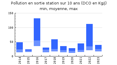 | Station d'épuration : Remplissage : Le volume total en entrée reçu à la station est de 246 716 m3. D'après la mesure en continu du débit en entrée de la station, en enlevant les deux jours à 0 m3/j, la moyenne annuelle est de 680 m3/jour soit 4 533 Equivalents habitants (EH). La pointe est de 2 363 m3/jour, soit 15 753 EH. Le volume minimum hors situation inhabituelle est quant à lui de 314 m3/jour soit 1 973 EH. A noter que le débit de pointe nominal de 1 450 m3/jour en temps de pluie a été dépassé 21 fois (contre 5 fois en 2022 et 22 fois en 2021 qui était aussi une année avec une plus forte pluviométrie). Le débit de référence calculé avec les volumes (A3+A2) de 2023 est de 1 714 m3/j et celui calculé avec les volumes des cinq dernières années (PC95 de 2019 à 2023) est de 1 402 m3/j (en 2023, il a été dépassé 22 fois). D'après les mesures d'autosurveillance de cette année 2023, la charge organique moyenne reçue en DBO5 est de 2 751 EH soit 32% de la charge nominale (en légère hausse par rapport à celle reçue en 2022). Le remplissage réel est inférieur au remplissage théorique, il paraît nécessaire de poursuivre les investigations pour vérifier le fonctionnement du réseau de collecte. Nombre de déversements d'eaux usées constaté en 2022 (point A2, poste des Cuisines) : Au niveau du déversoir d'orage du poste de relevage des Cuisines (point A2), 23 déversements ont été enregistrés pour un volume de 11 333 m3, soit 4,6% du volume en entrée. Cependant, 5 déversements correspondent à une situation inhabituelle puisque le déversoir était inondé par leau de la Borrèze à cause de forts orages ou dépisodes de crue (du 11 au 15 décembre). Un autre déversement est à écarter car il sagit dun volume simulé lors du contrôle métrologique de la sonde du poste (16 novembre). Ces déversements écartés représentent un volume de 1 446 m3. Lexploitant a déclaré au format SANDRE des événements codifiés accompagnés de commentaires mentionnant ces situations inhabituelles. Ainsi, le nombre de déversements réels est de 17 pour un volume déversé de 9 887 m3, soit 4% du volume en entrée. La vérification de la qualité de la mesure des déversements au point A2 réalisée le 16/11/2023 na pas été jugée satisfaisante. Il a mis en évidence un mauvais calage du zéro pour la mesure de la hauteur de déversement et par conséquent du volume déversé. Les déversements pourraient alors être sous-estimés. Il a donc été conseillé de faire un réglage du SOFREL et de recaler le zéro afin que la totalité de leffluent qui surverse soit comptabilisé. Entretien : La station bénéficie d'un suivi et dun entretien sérieux. Fonctionnement : Aucun dépassement des seuils de concentration règlementaires en sortie na été constaté et tous les rendements délimination ont été atteints. Les réglages sont adaptés aux besoins et la qualité de l'épuration est satisfaisante. Pour maintenir une bonne qualité de traitement, il est important de continuer à réaliser un suivi régulier des performances épuratoires pour lazote grâce aux tests bandelettes (estimation des concentrations en ions ammonium et nitrates) sur leau traitée, afin de pouvoir ajuster les réglages. Durant la période estivale, la zone de rejet végétalisée joue pleinement son rôle de protection de la rivière puisque la totalité du débit s'infiltre à ce niveau. Les refus de dégrillage suivent la filière des ordures ménagères : 0,75 tonne évacuée. Les sables récupérés sont évacués en filière spécifique : 2,2 tonnes évacuées. Autosurveillance : Lautosurveillance est réalisée une fois par mois par l'exploitant. Les analyses sont réalisées par un laboratoire agréé indépendant. Les mesures qui ont pu être vérifiées ont été jugées représentatives des charges traitées par la station. Impact visible sur le milieu récepteur : Néant. Usages sensibles en aval du système d'assainissement : Loisirs aquatiques tout le long de la rivière Dordogne. En période d'étiage la station ne rejette pas à la rivière, la totalité de l'eau |
