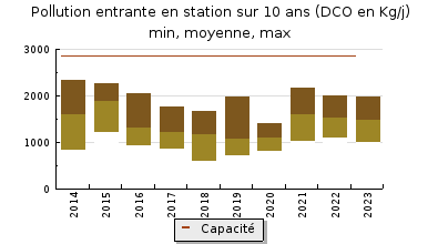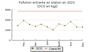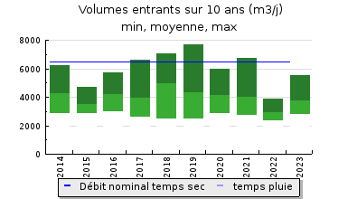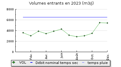 | Système de collecte : Les charges hydrauliques enregistrées en 2023 sont stables par rapport à l'année précédente. Pendant le mois de novembre et décembre assez pluvieux, les charges hydrauliques enregistrées ont été assez importantes. Par temps de pluies, le réseau de collecte est toujours très drainant en eaux claires parasites, la mise en conformité des secteurs définis comme prioritaires par le diagnostic des réseaux d'assainissement reste à poursuivre. D'un point de vue organique, les charges admises sont également stables et s'inscrivent dans la continuité de celles observées ces dernières années. |