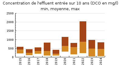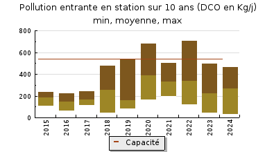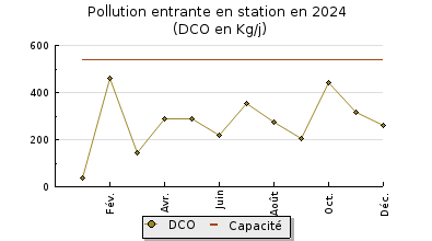 | Système de collecte : En 2024, les périodes de hautes eaux et les pluies régulières se sont répétées au printemps et à l'automne. Ainsi, les charges hydrauliques acheminées ont été importantes, elles ont oscillé entre 48 % et 193 % de la capacité hydraulique nominale de la station d'épuration. Ces dernières s'inscrivent cependant dans la continuité de celles déjà observées ces dernières années. Ce réseau de collecte reste désordonné sur plusieurs de ses secteurs sur lesquels des travaux de mise en séparatif sont à programmer en priorité afin de réduire ces phénomènes d'à-coups hydrauliques par temps de pluie. Le suivi et l'entretien des nombreux équipements qui composent ce système de collecte sont à poursuivre avec le même sérieux. |