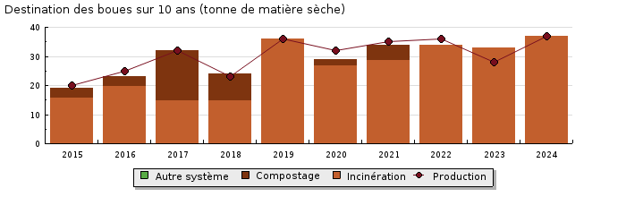 | Sous produits : Les boues épaissies sont centrifugées par une unité mobile de déshydratation de la société Suez qui intervient mensuellement. Les boues sont évacuées par benne vers lincinérateur de Lacq. Le système de drainage du silo nest plus fonctionnel. De ce fait, le silo fait lobjet dun remplissage complet à J-1 de lintervention de lunité mobile de déshydratation. Il est alimenté par la pompe de recirculation (jeu de vannes). Selon le fichier Sandre transmis par la collectivité, En 2024, 37,2 T(MS) soit 2480 EH sont envoyés pour incinération, En 2023 : 27,7 T (MS) soit 1850 EH (majoritairement en incinération). Depuis le 1er janvier 2022, le Syndicat Mixte pour le traitement des boues auquel le Syndicat adhérait et qui gérait lincinérateur de Lacq est dissous. Le syndicat a passé un marché avec la société EOVAL (nouveau propriétaire de lincinérateur) pour lincinération des boues sur le site de LACQ. Le Syndicat a aussi passé un marché pour le compostage des boues sur le site de Bellocq (SUEZ). La totalité des boues produites peuvent être envoyées vers lun ou lautre des deux sites. En fonctionnement normal des installations de traitement des boues, les boues de Tarsacq sont envoyées en compostage et les boues de LACQ-ABIDOS sont envoyées à lincinérateur. 2022 : 36,5 T (MS) correspondant à environ 2430 EH (majoritairement en incinération) 2021 : 32,8T (MS) correspondant à environ 2185 EH 2020 : 29,56T (MS) de boues résiduaires ont été évacuées, (2000 EH). |