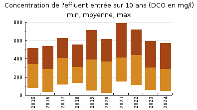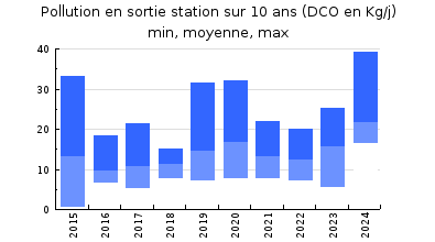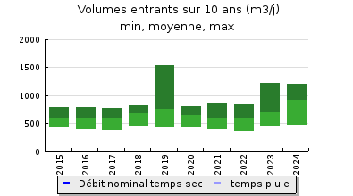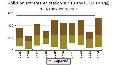 | Système de collecte : En 2024, le suivi départemental dans le cadre du dispositif Connaissance du programme NAIADE a été réalisé au moyen dune visite le 14 février par temps sec et dun bilan de performances sur 24 h le 7 octobre par temps humide (1 mm). Description : Ce réseau complexe est long et de configuration multiple. Il présente des parties unitaires et des parties séparatives et collecte des eaux claires parasites. A la suite dune pluie significative, la période de ressuyage est longue. Il comporte 18 postes de relevage : 5 à Pardies, 2 à Noguères, 2 à Os-Marsillon, 3 à Lagor, 5 à Lacq et 1 à Abidos. Fonctionnement : Le réseau collecte à la fois des eaux claires parasites permanentes (ECPP) et des eaux pluviales. Les résultats de lautosurveillance 2024 montrent que : - Au niveau du point A2, la valeur maximale est mesurée à 2 723 m3/j (le 11/03/2024 avec 41 mm de précipitations). - Le débit nominal de la station (600 m3/j) est respecté pour 44 jours dans lannée (130 en 2023), essentiellement entre juillet et août, les jours de temps sec. Sur lannée, la moyenne du flux traité avoisine 928 m3/j (700 m3/j en 2022-2021) toute météo confondue, le maximum se situant à 1296m3/j (1566 m3/j en 2023). Cette valeur est anormalement élevée car habituellement le syncopage des pompes de relevage limite le débit traité à une valeur proche du nominal de la station. Lors du bilan NAIADE doctobre par temps humide, les principaux postes de relevage sur le réseau de collecte ont été visités et ont correctement fonctionné. Le refoulement du poste Abos a été redirigé vers la station de Tarsacq depuis le 07/02/2022. Plusieurs postes présentent des usures importantes sur les parties mécaniques, électriques et structurelles (refoulement). Le projet de réhabilitation de ces postes sur le réseau est envisagé. Le volume deffluent parvenu et admis en traitement, avec 833 m3/j, correspond à environ 5550 EH hydrauliques (sur la base 1 EH = 150 l/j). Cette valeur est proche de la moyenne annuelle de 2024 (928 m3/j). Larrêt du système de régulation du débit (syncopage) depuis 2022 explique cette forte augmentation des débits traités. Daprès les données autosurveillance de 2024, - Si lon considère lensemble du flux collecté (point A3, débit traité + point A2, déversoir en tête, actif 172 jours en 2024), le débit moyen atteint 1028 m3/j (850 m3/j en 2023) avec un maximum à 4 019 m3/j. - Le volume deffluent brut déversé avant traitement, 36 640 m3/an pour un volume annuel traité de 340 750 m3, représente 10% du flux collecté (entre 17 et 25% pour les 4 années précédentes). - Le percentile 95 pour la période 2019-2024 se situe à 1862 m3/j. Flux collecté : Pour les mesures autosurveillance de 2024, les concentrations de leffluent brut sont caractéristiques deaux usées domestiques plus ou moins diluées en fonction de la météo et de la hauteur de la nappe. Sur lannée 2024, la charge admise en traitement varie de 485 à 2420 EH (330 EH à 2565 EH en 2023), la moyenne se situant à 1599 EH (1332 EH en 2023). Le nombre de raccordés serait denviron 1484 (selon RPQS 2021). Etudes et travaux : Le dernier SDA engagé par la collectivité (réalisé par G2C) est terminé depuis 2018. La collectivité a poursuivi des travaux de mise en séparatif ou de réhabilitation à PARDIES, à ABIDOS et à LAGOR ces dernières années. Les canalisations situées sous le pont de Lacq ont aussi été changées pendant les travaux de réhabilitation complète du pont. Un schéma directeur de gestion des eaux pluviales (confié à HEA) sur les communes adhérentes au syndicat Gave et Baise pour la compétence assainissement (hormis celle de la CAPBP) a été réalisé à linitiative du Syndicat (maitrise douvrage déléguée). Le projet de raccordement de ce système dassainissement à la station dépuration de Mourenx est prévu pour être opérationnel en novembre 2025. Il y aura un stockage sur site pour respecter les consignes d'admission de flux sur la station dépuration de Mourenx. |