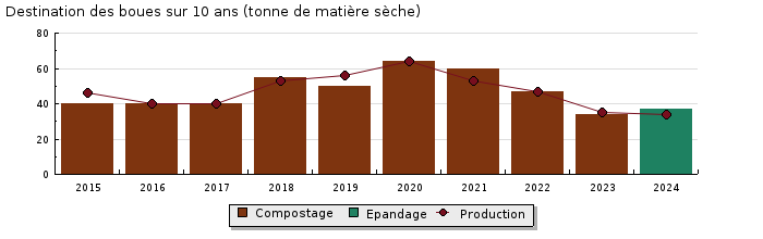 | Sous produits : Lancienne filière a été conservée. Un stockeur à boues est rempli à laide de boues soutirées du réacteur membranaire, puis elles sont déshydratées à laide dune ADEQUAPRESS. Les boues sont ensuite stockées dans des bennes avant dêtre acheminées vers une unité de compostage Terralys. Lors du bilan de mars 2024, ladéquapresse est à larrêt depuis plusieurs mois, cet équipement nétant pas fonctionnel. Lors de la visite NAIADE doctobre 2024, une nouvelle presse est en cours dinstallation. Pour 2024, la production annuelle est de 33,5T de matières sèches. Pour 2023, la production annuelle est de 34,2T de matières sèches. Pour 2022, la production annuelle est de 46,5T de matières sèches. |
