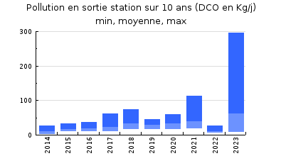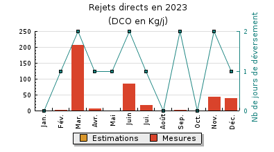 | Station d'épuration : Le syndicat dassainissement a reconstruit en 2013-2014 une nouvelle station de capacité de 6000 EH, extensible à 9000 EH, mise en service en mars 2014. La capacité hydraulique nominale de temps sec est de 900 m3/j et de 1600 m3/j pour le temps de pluie. La filière en place est un bioréacteur à membranes. Les éléments composant la filière eau sont les suivants : Les effluents sont admis dans la filière de traitement via un poste de poste de relevage équipé de deux pompes à débit variable pilotées par une sonde de niveau et autorisées à fonctionner uniquement si le niveau dans le bassin daération est inférieur à 5m60. Le prétraitement est ensuite assuré par deux tamis rotatifs de maille 1 mm installés en parallèle. Pour notre visite davril, la vis de compactage des refus de tamisage qui était cassée avait été réparée le 1er avril. Une vanne automatique permet en sortie des tamis de réguler le débit vers la zone anaérobie, lalimentation de cette dernière nétant autorisée que si le niveau dans le bassin daération est inférieur à 5m50. Dans le cas contraire, les effluents sont dirigés vers le bassin dorage de volume 600m3 (ancien bassin séquentiel). Létage biologique est composé dune zone anoxie suivi du bassin daération de 1100 m3 aéré par 4 rampes alimentées par 2 surpresseurs dont le fonctionnement est commandé par une sonde oxygène. Un réacteur membranaire composé de 2 modules membranaires, équipés chacun de 2 étages de membranes plaques complète la filière de traitement. Une injection de chlorure ferrique permet de traiter le phosphore. Au cours de lannée 2023, les charges évaluées à partir des mesures dautosurveillance de lexploitant sont les suivantes : Hydraulique : 46 à 142 %, moyenne à 75% (70% pour le bilan NAIADE) Organique : 13 à 87%, moyenne à 42 % (53% pour le bilan NAIADE) Pour nos deux passages en 2023, le taux de boues dans le bassin daération est compris entre 9,8 et 10,6/L. Cette valeur élevée sexplique par la panne au niveau de la vis de convoyage permettant lacheminement vers la presse à boues. Pour notre bilan, comme pour les mesures dautosurveillance, les rendements épuratoires sont satisfaisants sur tous les paramètres; supérieurs à 86% sur la DBO5, DCO et MES, lazote global est en moyenne annuelle traité à 77% par le phénomène de nitrification-dénitrification. Le phosphore est dégradé en moyenne à plus de 91% par voie physico-chimique. Les normes de rejet sont exigeantes, 52 mg/l pour la DCO, 17 mg/l pour la DBO5, 13 mg/l pour les MES, 3 mg/l pour lazote global et 0,7 mg/l pour le phosphore. Pour 2023, le rejet est de bonne qualité pour toutes les mesures dautosurveillance et aucun dépassement nest observé pour tous ces paramètres. |