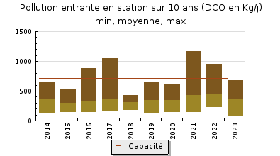 | Système de collecte : Le réseau dassainissement est assez long, desservant les communes dAndoins, Espoey, Limendous, Gomer, Soumoulou et Nousty, auxquelles sajoutent maintenant celles de Barzun et Livron (canalisation de transfert depuis lancienne station de Livron où un poste de relevage a été installé). Certains tronçons sont anciens de type unitaire (centre-bourg), les nouvelles antennes sont de type séparatif. Des extensions de collecte desservant des quartiers périphériques sont construites tous les ans selon un programme pluri-annuel porté par le syndicat deau et dassainissement Béarn-Bigorre. On dénombre 6 déversoirs dorage et 1 trop plein sur le poste de mise en charge de Nousty qui permettent de délester le flux en cas de surcharge hydraulique. Les principaux postes de relevage sont les suivants : - Poste de relevage «MATTETS SOUMOULOU » il restitue les effluents vers la station dépuration. - Poste de mise en charge « NOUSTY » : le fonctionnement de lélectrovanne est géré par des poires de niveau. -Poste de relevage HOURS : en service depuis février 2019. Il refoule les effluents vers le poste de relevage Livron. - Poste de relevage LIVRON : ce poste a été mis en service en aout 2018. Il est équipé dun système de désodorisation et dinjection afin de limiter la production dH2S sur le réseau. Ce poste est équipé de 2 pompes « Temps sec » et de 2 pompes « Temps de pluie ». Un bassin dorage y est annexé (ancien bassin séquentiel de Livron). Le suivi départemental 2023 a été assuré par une visite avec analyses le 31 mars et un bilan de performance sur 24 heures le 10 juillet A partir des résultats de lautosurveillance 2023, on peut indiquer que - le débit moyen journalier traité sur lannée toute météo confondue se situe à 1200 m3/j toute condition météorologique confondue, il est supérieur à celui de 2022 qui fut une année très sèche (934 m3/j). Par temps sec, le volume moyen est de 1120 m3/j. Le percentile 95 est de 2017 m3/j. - le déversoir en tête de station nest quasiment pas actif avec seulement 9 déversements observés sur lannée, le maximum se situant à 1000 m3/j. le 27 mars 2023. Ces déversements représentent seulement 0,5% des 438 470 m3 traités annuellement par linstallation. - Par temps de pluie, les débits collectés et parvenant à la station augmentent encore pouvant largement atteindre 1600m3/j la capacité nominale de temps de pluie des équipements (73 fois en 2023, 30 fois en 2022, 63 fois en 2021) et dépassent 2000 m3/j lors des fortes intempéries (12 fois en 2023 comme en 2022). De plus, lors des fortes périodes pluvieuses, il y a des délestages sur le réseau par les déversoirs et les trop-pleins de postes, tout le flux collecté narrive pas à la station. Pour limiter les déversements deffluent non traités et fiabiliser la collecte, un bassin tampon de 450 m3 a été construit sur le réseau. Dapprès les 13 mesures dautosurveillance, même par temps sec, les concentrations de leffluent brut sont caractéristiques des eaux usées domestiques moyennement concentrées (DCO moyenne = 375 mg/l) sauf pour lautosurveilance du 24 octobre avec une DCO de 776 mg/l. La charge organique à traiter varie de 752 à 5245 équivalents habitants. La moyenne des mesures sur lannée 2023 est de 2940 EH Selon le RPQS 2018, le nombre dabonnés au système dassainissement est de 1718. A partir de la charge moyenne annuelle, on peut établir le ratio de 1,7 EH/abonné. Avec un volume collecté de 1114 m3/j, le bilan NAIADE de juillet se situe dans le moyenne annuelle (1200 m3/j). Les concentrations de leffluent brut sont caractéristiques des eaux usées domestiques diluées de moitié (DCO = 605 mg/l et DBO5 = 170 mg/l). Avec 674 kg DCO/j et 189 kg DBO5/j, la charge organique à traiter correspond à environ 4 385 équivalents habitants (sur la base DBO5 pondérée par la DCO à raison de 1 EH = 60 g DBO5 et 1 EH = 120 g DCO). Le ratio moyen est de 1,7 EH/abonné. |