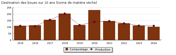 | Sous produits : Une presse à vis a été installée en 2018 en supplément de la centrifugeuse mise en place en 2012. Les boues centrifugées ou pressées sont mises en benne et traitées sur une plateforme de compostage de statut privée (Suez Organique), située à Pontacq (64). Pour lannée 2024, la production déclarée par lexploitant est de 109 tonnes de matière sèche. Cette production est identique à celle de lannée précédente. 2023 : 107 Tonnes de matières sèches 2022 : 128 Tonnes de matières sèches 2021 : 146 Tonnes de matières sèches |