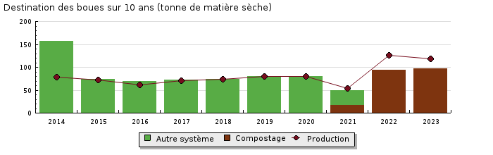 | Sous produits : La nouvelle station dépuration est équipée de 2 centrifugeuses pour déshydrater les boues. Les boues centrifugées sont stockées dans 2 bennes (capacité unitaire 20 m3) couvertes puis évacuées pour compostage au centre de Bellocq. Pour lannée 2022, 125 tonnes de matières sèches ont été produites. Pour lannée 2023, 117 tonnes de matières sèches ont été produites. La station dispose également dun traitement spécifique pour les matières de vidange (broyeur + tamis de 6 mm) et les matières de curage (Tromel). |