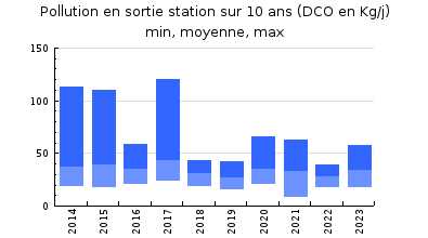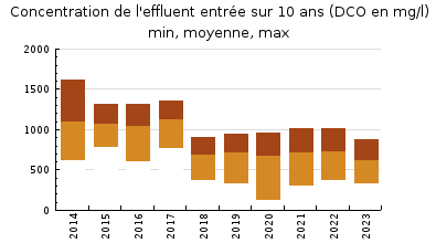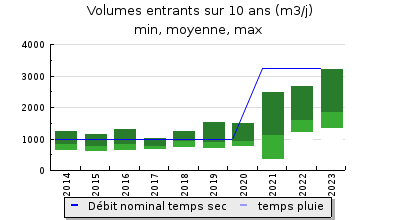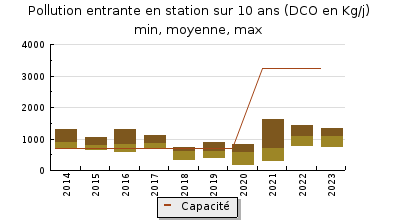 | Système de collecte : En 2023, dans le cadre du suivi départemental du programme NAIADE, une visite a été réalisée le 10 août. Les postes principaux qui alimentent la station sont : - Le PR DELVAILLE : les effluents des postes de relevage SP0 et SP1 (ancienne station de Saint Frédéric) sont refoulés vers le bassin dorage Quai Lesseps (V = 500 m3) puis vers ce poste. Il est équipé de 3 pompes sur sonde US Endress Hauser et poires en secours. Le débit maximal est de 360 m3/h. Il est équipé dun système de désodorisation et dun trop-plein équipé dun débitmètre. - Le PR GLIZE : les effluents du poste BILBAO sont refoulés vers ce poste qui aliment la station. Le débit maximal est de 350m3/h. - Le PR BRAMARIE : actuellement il refoule dans le Poste Bilbao. Il devrait refouler à terme directement à la station dépuration. Environ 80% des eaux proviennent du PR Delvaille et 20% du PR Bilbao. A partir des données dautosurveillance transmises par lexploitant pour lannée 2023 : - le débit moyen journalier entrant dans la station dépuration est de 1 868 m3/j (1 593 m3/j en 2022), toute météo confondue. - par temps sec, le réseau collecte 1 000 à 1 400 m3/j deaux usées ; comme en 2022. - par temps de pluie, le réseau collecte des eaux météoriques en quantité importante. Les volumes parvenus sur la nouvelle unité de traitement peuvent dépasser la capacité nominale hydraulique (3 250 m3/j). Des volumes de 3 000 à 7 700 m3/j ont été mesurés en 2023. Le débit maximum a été mesuré le 17 janvier au cours dune période très pluvieuse (7 716 m3/j ; 121 mm de pluie en 2 jours). La capacité hydraulique de la station a été dépassée au cours de 34 journées La nouvelle station est équipée dun point de déversement en tête (point A2) et dun bassin de régulation avec écrêtage possible du débit (point A5). Ces points nont quasiment pas été actifs. - la possible intrusion des eaux marines dans le réseau dassainissement influe sur la concentration de leffluent brut. En effet, la salinité a tendance à doser la DCO. Cest la raison pour laquelle, comme en 2022 ; la DCO de leffluent brut est dans lensemble assez élevée quelques soient les conditions météorologiques, de 205 à 981 mg/l (moyenne : 626 mg/l). La visite que nous avons réalisée le 10 août confirme que la conductivité de leffluent est élevée (3 480 µS/cm). - les flux de pollution organiques parvenant jusquà la station varient de 4 700 à 8 900 EH organiques (les flux sont calculés uniquement sur la DBO5 ; pour saffranchir déventuels surdosages de la DCO). Le flux moyen annuel représente 7 500 EH, comme en 2022. Pour 80% des autosurveillances, ce flux de pollution mesuré sur la DBO5 varie de 6 800 à 8 400 EH. |