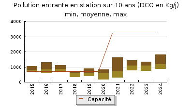| Système de collecte : En 2024, dans le cadre du suivi départemental du programme NAIADE, une visite a été réalisée le 19 juillet. Les postes principaux qui alimentent la station sont : - Le PR DELVAILLE : les effluents des postes de relevage SP0 et SP1 (ancienne station de Saint Frédéric) sont refoulés vers le bassin dorage Quai Lesseps (V = 500 m3) puis vers ce poste. Il est équipé de 3 pompes sur sonde US Endress Hauser et poires en secours. Le débit maximal est de 360 m3/h. Il est équipé dun système de désodorisation et dun trop-plein équipé dun débitmètre. - Le PR GLIZE : les effluents du poste BILBAO sont refoulés vers ce poste qui aliment la station. Le débit maximal est de 350m3/h. - Le PR BRAMARIE, raccordé à la station depuis avril 2024. A partir des données dautosurveillance transmises par lexploitant pour lannée 2024 : - le débit moyen journalier entrant dans la station dépuration est de 1 982 m3/j toute météo confondue (1 868 m3/j en 2024 ; 1 593 m3/j en 2022). - par temps sec, le réseau collecte 1 200 à 1 500 m3/j deaux usées (1 000 à 1 400 m3/j en 2023 et 2022). - par temps de pluie, le réseau collecte des eaux météoriques en quantité importante. Les volumes parvenus sur la nouvelle unité de traitement peuvent dépasser la capacité nominale hydraulique (3 250 m3/j). Des volumes de 3 000 à 7 400 m3/j ont été mesurés en 2024, comme en 2023. Le débit maximum a été mesuré le 24 février au cours dune période très pluvieuse (7 427 m3/j ; 70mm de pluie en 2 jours). La capacité hydraulique de la station a été dépassée au cours de 42 journées (34 en 2023). La nouvelle station est équipée dun point de déversement en tête (point A2) et dun bassin de régulation avec écrêtage possible du débit (point A5). Ces points nont quasiment pas été actifs, comme en 2023. - la possible intrusion des eaux marines dans le réseau dassainissement influe sur la concentration de leffluent brut. En effet, la salinité a tendance à doser la DCO. Cest la raison pour laquelle, comme en 2022 et 2023, la DCO de leffluent brut est dans lensemble assez élevée quelques soient les conditions météorologiques, de 298 à 833 mg/l (moyenne : 605 mg/l). - les flux de pollution organiques parvenant jusquà la station varient de 5 500 à 8 800 EH organiques (les flux sont calculés uniquement sur la DBO5 ; pour saffranchir déventuels surdosages de la DCO). Le flux moyen annuel représente 7 500 EH, comme en 2022 et 2023. Le jour de notre visite du 19 juillet par temps sec, la station a traité ce jour-là 1909 m3 : - 1594 m3 proviennent du PR DELVAILLE (83%) - 129 m3 proviennent du PR BILBAO (7%) - 221 m3 proviennent du PR BRAMARIE (10%) |