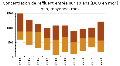 | Système de collecte : En 2023, dans le cadre du suivi départemental du programme NAIADE, un bilan de performances sur 24 heures le17avril (temps sec mais pluie la veille) et une visite avec analyses le 13 septembre (temps sec) ont été réalisés. 1355 abonnés sont collectés au réseau deaux usées (indication SIA Porte dAspe). Le syndicat a actualisé son schéma dassainissement en 2016-2017. Le réseau dassainissement est assez long, desservant les communes dASASP-ARROS, GURMENCON, AGNOS et BIDOS. Certains tronçons sont anciens (centre-bourg) mais dautres sont récents collectant des quartiers excentrés ou nouvellement bâtis. La nature de la collecte est variée; du type unitaire, pseudo-séparatif ou séparatif. Certains tronçons ont fait lobjet dune reconstruction ou de réhabilitation comme le refoulement et la canalisation de transfert en provenance de Bidos. Sur le réseau présence de 4 postes de relevage (1 à BIDOS, 1 à GURMENCON et 2 à AGNOS). Plusieurs déversoirs d'orage (DO) permettent de délester l'effluent brut directement vers le milieu naturel lors des épisodes pluvieux. Les principaux déversoirs d'orage se trouvent en amont du PR de BIDOS et en amont de la station d'épuration. Un bassin dorage, situé dans lenceinte de la station, est en service depuis fin 2012. Daprès les valeurs de lautosurveillance réalisée par lexploitant en 2023 : Remarque : le 8 janvier 2023, sur le fichier Sandre communiqué par lexploitant, il y a deux erreurs de frappe : le Volume Entrée est 660 m3/j et pas 0 m3/j et le volume Sortie est 731 m3/j et pas 31 m3/j. Ces valeurs corrigées ont été prises en compte dans les calculs. - la moyenne des débits traités (entrée station) est de 560 m3/j, toute météo confondue. Le minimum se situe à 119 m3/j le 7 janvier et le maximum à 2 583 m3/j le 17 janvier avec 49 mm de pluie ce jour-là et 42 mm cumulés la semaine précédente, soit 2,5 fois la capacité nominale de la station dépuration (1000m3/j). - En 2023, le déversoir en tête de station (point A2) a été actif à 29 reprises. Pour ces déversements, les volumes enregistrés varient de 32 m3/j à 921 m3/j. Le volume by-passé annuellement au niveau de lentrée station (environ 5 122 m3/an) représente à 2,5% du flux qui parvient en ce point (204 400 m3/an) - Les volumes les plus importants sont directement liés à la pluviométrie. En 2023, la capacité hydraulique a été dépassée à 34 reprises. - le percentile 95 est de 1 061 m3/j (1 149 m3/j en 2022) . Pour les bilans dautosurveillance de 2023 : - par temps sec, hors période de ressuyage, les concentrations de leffluent brut sont caractéristiques des eaux usées domestiques normalement concentrées (DCO : 770 à 1 210 mg/l). La charge organique à traiter varie de 1 200 EH à 3100 EH avec une charge moyenne à 1 900 EH. - Cette charge moyenne est en adéquation avec le nombre dabonnés (1335 abonnés). Le ratio obtenu est de 1,4 EH/ abonné ; en zone rurale le ratio est de 1,5 EH/abonné. Lors du bilan NAIADE davril, qui sest déroulé par temps sec mais suite à un épisode pluvieux la veille, le débit traité par la station est de 435 m3/j et correspond à environ 2 900 EH hydrauliques (sur la base 1 EH = 150 l/j). Ce volume est du même ordre de grandeur que celui mesuré lors de notre précédente intervention de septembre 2022 par temps humide (480 m3). Les concentrations de leffluent brut sont caractéristiques des eaux usées domestiques moyennement concentrées (DCO = 683 mg/l). La charge organique à traiter correspond à environ 2 000 EH organiques (sur la base de la DBO5 pondérée par la DCO à raison de 1 EH = 60 g DBO5 et 1 EH = 120 g DCO). Ce résultat est semblable à la charge moyenne obtenue par le suivi dautosurveillance de lexploitant. |