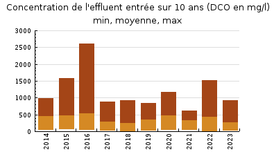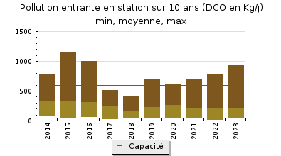 | Système de collecte : En 2023, le suivi départemental (NAIADE) a été éralisé par 1 bilan 24h le 10 juillet et une visite avec analyses le 16 novembre. Description : Le réseau séparatif se situe de part et d'autre du gave d'Oloron. Rive droite, il dessert NAVARRENX et JASSES (PR du "Pont neuf"), rive Gauche les effluents de GURS, SUS, SUSMIOU et CASTETNAU-CAMBLONG arrivent gravitairement à la station. Deux déversements successifs sont possibles : un via le DO en amont de la station (point A2) et un après dégrillage (Point A5, données non transmises). Selon le SDA de 2019-2020, le nombre dabonnés est de 1289. 4 déversoirs d'orage ont été équipés en 2017 d'une mesure de durée de surverse (déversoirs de la poste, Plek, route de Jasses et Pont neuf). (Données non transmises). Fonctionnement : En ce qui concerne le flux hydraulique, l'analyse des données autosurveillance pour 2023 indique les éléments suivants : - Le point A2 est actif (plus de 10 m3/j) 128 jours/an (85 en 2022), correspondant à 16% du flux global (A2 +A3) . - Quelle que soit la saison, le débit collecté augmente de façon significative lors des épisodes pluvieux. Le maximum mesuré en amont de la station est proche de 6700 m3/j (si le débitmètre est adapté à la mesure de débits dans cette gamme). - Pour le flux global, en période de nappe haute ou par temps de pluie, le débit est souvent supérieur à la capacité des ouvrages (700 m3/j). La moyenne annuelle atteint 985 m3/j (784 m3/j en 2022). Le percentile 95 sur la période 2019 à 2023 est établi à 2607 m3/j. - Malgré ces délestages, la station traite un débit supérieur à sa 140% de sa capacité nominale 115 jours/an (autour de 70 jours en 2022 et en 2021). Le maximum, 2203 m3/j, est équivalent aux maxima de 2022 et 2021 avec, respectivement, 2308 et 2145 m3/j (sous réserve que les équipements en place aient la capacité de mesurer des débits aussi élevés). - La moyenne de temps sec sur lannée est denviron 700 m3/j. Il est possible de distinguer 2 périodes : ? nappe haute : De novembre à fin avril : la moyenne des débits traités sur cette période se situe à environ 1070 m3/j en 2023. - La période de nappe basse : mi-mai à mi-octobre, le débit moyen toutes météos confondues, 500 m3/j, est alors inférieur à la capacité nominale (700 m3/j). Pour notre bilan par temps sec de juillet 2023, le débit à traiter est proche de 440 m3/j dont 264 m3/j deaux claires parasites et 170 à 180 m3/j deaux usées strictes. Les valeurs les plus faibles sont mesurées début octobre après une longue période de temps sec, entre 120 et 140 m3/j. des exfiltrations ne sont pas exclues dans ce contexte. Une partie des travaux de mise en séparatif est achevée depuis 2021. Limpact des travaux est difficilement évaluable à la station. Pour 2023, avec 1455 mm/an, le volume amont station est supérieur à celui de 2020 (1550 mm/an) avec environ 40 000 m3 supplémentaires. Flux polluant : Pour les autosurveillances réalisées par lexploitant en 2023, les concentrations de l'effluent brut sont très variables (de concentrées à extrêmement diluées) et directement liées à la pluviométrie et à la hauteur de la nappe. La charge polluante mesurée avant le by-pass interne de la station, une fois une valeur extrême à 9280 EH écartée, varie en 2023, de 154 à 3470 EH (257 à 3660 EH en 2022). Comme en 2021 et en 2022, la moyenne des 11 mesures dautosurveillance avec indique une charge de lordre de 1400 EH. Presque 2000 EH ont été mesurés pour notre bilan de juillet 2023. Etudes et travaux Le programme de travaux établi à la suite de lactualisation du SDA (2018-2020) et du schéma directeur des eaux pluviales prévoit selon les secteurs, une mise en séparatif, la déconnexion des particuliers, des travaux de réhabilitation pour réduire le débit et la durée du ressuyage (réduction théorique de 50% des ECP). Deux tranches de travaux se sont succédé et devaient se terminer fin août 2023. |