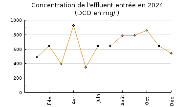 | Système de collecte : Le réseau dassainissement est du type unitaire sur le bourg ancien, les lotissements récents sont en séparatif. La collecte des eaux usées domestiques se fait principalement de façon gravitaire. Le nombre dabonnés est de 704 (selon RPQS 2023 du SMEATC) avec la présence de restaurants et dentreprises. En 2024, dans le cadre du suivi départemental du programme NAIADE, il a été réalisé une visite simple le 13 juin par temps sec et un bilan 24h le 5 décembre par temps pluvieux (6 mm de précipitations cumulées). Selon les données dautosurveillance 2024 transmises par la collectivité, le réseau collecte massivement des eaux pluviales. Le volume moyen entrant par temps sec est de 176 m3/j (200 m3/j en 2023), la moyenne toute météo confondue atteint 291 m3/j. La capacité nominale hydraulique (410 m3/j) a été dépassée à 65 reprises avec un maximum de 1429 m3/j le 16 février avec 24 mm de pluie et 43 mm cumulés la semaine précédente. Le percentile 95 est de 947 m3/j sur les 5 dernières années Au cours de lannée 2024, on dénombre 27 jours (25 jours en 2023) pour lesquels le point A2 a by passé de plus de 50 m3/j. Le volume annuel cumulé sur ce point A2 est de 13 616 m3/an ce qui représente 11% du volume total entrant (106 521 m3/an). Lors du bilan NAIADE du 5 décembre, réalisé par temps pluvieux (6 mm de précipitations cumulées),le by-pass au niveau du déversoir présent sur le réseau de collecte a été ponctuellement actif durant la mesure. Avec 277 m3/j, le volume entrant correspond à 1845 EH hydrauliques (sur la base d1EH = 150 l/j). Ce débit est inférieur à celui mesuré dans les mêmes conditions en mai 2023 (340 m3/j). Selon les données autosurveillance transmise par la collectivité, le volume moyen entrant par temps pluie est de 273 m3/j. Les débits collectés fluctuent en fonction des conditions météorologiques témoignant de la collecte deaux claires parasites dorigine météoriques, une partie du réseau étant unitaire. Leffluent brut est partiellement dilué (DCO = 530 mg/l). Avec 75 kgDBO5 et 147 kg DCO, la charge mesurée en entrée de station pour ce bilan correspond à 1234 EH organiques (DBO5 pondérée par la DCO ; sur la base d1 EH = 60 g DBO5 /j et 120 g DCO/j). Selon les données dautosurveillance 2024, la charge organique varie de 509 à 2070 EH avec une moyenne de 883 EH. |
