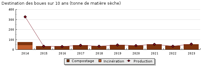 | Sous produits : Les boues sont déshydratées puis sont évacuées vers des plateformes de compostage du groupe Terralys ou sur lincinérateur de Lacq. Pour lannée 2021, 5 458 m3 de boues ont été produites. Après déshydratation, 248 tonnes de boues brutes (poids des bennes) ont été évacuées, soit 52,7 tonnes de matières sèches Pour lannée 2022, 2 564 m3 de boues ont été produites (concentration moyenne : 13 g/l). Après déshydratation, 204 tonnes de boues brutes (poids des bennes) ont été évacuées, soit 36,7 tonnes de matières sèches (18% de siccité en moyenne). Depuis février 2022, les boues ont été acheminées à lincinérateur de Lacq Pour lannée 2023, 5 620 m3 de boues ont été produites. Après déshydratation, 279 tonnes de boues brutes (poids des bennes) ont été évacuées, soit 51,8 tonnes de matières sèches. |