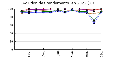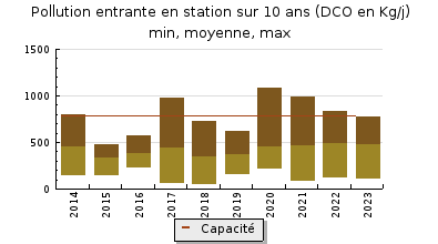 | Station d'épuration : Description : La station dépuration est un système à boues activées. Après les prétraitements comprenant un dégrilleur 6 mm et un dégraisseur-dessableur, les effluents transitent par une zone de contact (mélange des effluents prétraités, des boues recirculées et des eaux de colature) avant de rejoindre le bassin daération puis le clarificateur. La station est également équipée : - dun bassin tampon pour réguler les effluents par temps de pluie, - dune unité de déphosphatation, linjection de chlorure ferrique est réalisée au niveau du bassin de contact, en amont de laération, - dun traitement tertiaire de désinfection par ultra-violet, à larrêt depuis le 29/05/20. La station dépuration est dimensionnée pour traiter un débit de temps sec de 777 m3/j et un débit de pointe « temps sec » de 75 m3/h, avec une possibilité de traiter temporairement un volume journalier maximal de 1 800 m3/j par temps de pluie. Taux de remplissage : Elle a fonctionné en 2023 avec un taux de remplissage hydraulique de 25 à 55% par temps sec (par rapport au débit nominal de temps sec). Par temps de pluie, les débits traités par la station restent inférieurs à 1 800 m3/j (débit maximal admissible par temps de pluie) ; lécrêtage est réalisé par le DO entrée station (A2). Le taux de charge organique, quant à lui, varie de 20 à 75%. Le taux de charge organique moyen pour lannée 2023 est de 50%. Au cours de notre bilan du 10 août, la station a fonctionné avec les taux de charge suivants : - Hydraulique : 45 % (par rapport au débit de temps sec), - Organique : 66 % sur la DBO5 ; 59 % sur la DCO Fonctionnement : Lentretien réalisé sur lunité de traitement et le réseau de collecte est satisfaisant. Au cours de notre bilan du 10 août 2023, la station dépuration présente un bon état de fonctionnement. Les prétraitements fonctionnent bien. Les effluents sont ensuite traités sur deux bassins daération en parallèle. Le taux de boues moyen dans les 2 bassins daération est correct (MES : 3,2 g/l). Les boues présentent une bonne aptitude à la décantation (IB : 113 cm3/g MES). Les vitesses ascensionnelles évaluées au niveau du clarificateur sont satisfaisantes, à la fois sur le débit moyen horaire (0,09 m/h) et sur le débit de pointe horaire (0,15 m/h) ; elles témoignent dune bonne décantation des boues. Le rejet est de bonne qualité. Les rendements épuratoires sont excellents, supérieurs à 96 % sur lensemble des paramètres carbonés, azotés, phosphorés et les matières en suspension. Le dispositif dautosurveillance fonctionne correctement. On constate toujours un écart de volume entre lentrée et la sortie. Certains compteurs de la supervision sont bloqués et nincrémentent plus malgré le fonctionnement des ouvrages. Le rendement énergétique, avec 2,7 KW.h/Kg DBO5 éliminé, est légèrement défavorable. Pour notre visite du 4 avril, la station présente également un bon état de fonctionnement. Performances : Les données dautosurveillance de lexploitant indiquent une bonne qualité de rejet tout au long de lannée 2023 ; les rendements moyens annuels sont supérieurs à 90% sur tous les paramètres. |