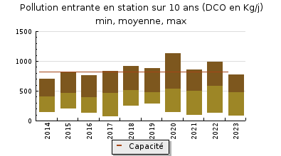 | Système de collecte : En 2023, dans le cadre du suivi départemental du programme NAIADE, il a été réalisé une visite avec analyses le 10 mars par temps humide et un bilan 24 heures le 27 septembre, par temps sec. La grande majorité des effluents proviennent du poste de refoulement Hasketa (ancienne station dépuration). Ce poste, équipé dun dégrilleur automatique, fait également office de bassin tampon par temps de pluie. Un dessableur a été installé en amont du poste pour piéger les sables et graviers. A partir des données dautosurveillance transmises par la collectivité pour lannée 2023, qui ne concernent que la station dépuration (les déversements au niveau du poste Hasketa ne sont donc pas pris en compte) : - le volume journalier moyen à traiter toute météo confondue est de lordre de 972 m3/j (787 m3/j en 2022 ;855 m3/j en 2021, 890 m3/j en 2020 ; 915 m3/j en 2019), -- le percentile 95 des débits entrants est de 2 367 m3/j sur les 5 dernières années (2 385 m3/j en 2022), - par temps sec, le débit moyen est de 711 m3/j, - le réseau collecte des eaux pluviales. Comme pour les années précédentes, la charge hydraulique parvenant jusquà la station augmente de façon significative par temps de pluie. Cette situation entraîne des déversements à lentrée de la station dépuration qui restent limités (291 m3/an en 2023), et des déversements importants au niveau du bassin tampon Hasketa (non quantifiés). - Par temps de pluie, les débits parvenant à la station dépuration ont dépassé le débit de référence (1245 m3/j) à 80 reprises. Le maximum mesuré en 2023 est de 2 995 m3/j (le 22 décembre novembre ; 22 mm de pluie ce jour-là et 42 mm cumulés sur 7 jours). A ce volume, il convient de rajouter les flux déversés au niveau du poste Hasketa (non comptabilisés). - leffluent brut est normalement concentré par temps sec et plus ou moins dilué par temps de pluie en fonction de la pluviométrie. La concentration en DCO est comprise entre 80 et 984 mg/l. La DCO moyenne est de 570 mg/l. - La charge organique à traiter, évaluée sur la DBO5 pondérée par la DCO, varie de 1 660 à 5 860 EH organiques. Par temps sec, la charge moyenne est de 3 400 EH soit 42% de la capacité organique de la station. Au cours de notre bilan 24 heures réalisé le 27 septembre par temps sec, le bassin tampon « Hasketa » a été visité pendant la mesure. La majorité des effluents collectés transitent par cet ouvrage. Un dessableur installé en amont piège les sables et graviers. Le trop-plein de louvrage est équipé dun débitmètre électromagnétique. Il a été vérifié par un organisme de contrôle agréé et il fonctionne correctement. La surverse est restée inactive pendant toute létendue de la mesure. Dans ces conditions, le débit collecté est de 600 m3/j, ce qui représente environ 4 000 EH hydrauliques (sur la base de 1 EH : 150 L/j). Il est du même ordre de grandeur que ceux mesurés habituellement par temps sec ; il est toutefois légèrement supérieur (de 10%) à ceux appréhendés lors de nos trois précédents bilans 24h de temps sec réalisés en novembre 2022 (542 m3/j), en mai 2021 (526 m3/j) et en novembre 2020 (558 m3/j). Lalimentation en entrée station dépend essentiellement du fonctionnement du bassin tampon « Hasketa ». Pour cette mesure, le bassin a déstocké à 9 reprises (cf. courbe de débit entrée station en page 13). Leffluent brut est moyennement concentré (DCO = 644 mg/l). Avec 180 kg DBO5/j et 386 kg DCO/j, la charge à traiter correspond à environ 3 111 EH (sur la base de 1 EH : 120 g DCO/j et 60 g DBO5/j). Ce flux est semblable au flux moyen (3400 EH) selon les données dautosurveillance de 2023. |