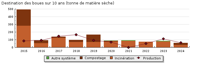 | Sous produits : 2 pompes de type Seepex en alternance toutes les 12 h prélèvent les boues du puits de recirculation pour les injecter vers le floculateur. Un débitmètre électromagnétique comptabilise les boues avant le traitement. En 2024, 61 T de matière sèche ont été évacuées pour incinération à lusine de Lacq. En 2023, 109,6 T de matière sèche ont été évacuées pour incinération à lusine de Lacq. En 2022, 72,3 T de matière sèche ont été évacuées. |