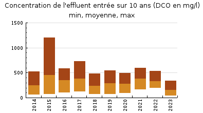 | Système de collecte : 6 communes sont raccordées sur la station d'épuration : IDRON, LEE, OUSSE, SENDETS, ANDOINS Sud et ARTIGUELOUTAN. Une partie du réseau dIDRON nest plus connecté à la station (au niveau du déversoir dorage « 46 »). Il est raccordé au réseau dassainissement de PAU (Station dépuration de LESCAR). Le réseau d'assainissement d'Idron, Lee, Ousse et Artigueloutan est géré par la Communauté dAgglomération Pau Pyrénées. Les différents postes de relevage sont exploités par la société SEIHE. En 2023, des travaux sur le réseau dassainissement ont continué : louvrage de régulation situé avenue de Beaumont et chemin Courtiade à Idron a été relié au réseau de Bizanos afin de délester la station dIdron dune partie des effluents bruts (300 à 400 EH) pour les envoyer sur la station de Lescar. Les postes de mise en charge « Arrouturous », « Domaine dEstrées » et le déversoir dorage « Amilcar » sont gérés par la Communauté dAgglomération Pau Pyrénées. Les flux collectés varient selon les conditions météorologiques, les tronçons unitaires étant importants. Concernant les données dautosurveillance 2023, les données prises en compte dans les commentaires ci-dessous sont celles relatives au DO amont station (point A2) et à lentrée de la station dépuration (point A3). - des déversements supérieurs à 50 m3/j ont été constatés au niveau du déversoir amont station pendant 31 jours sur lannée, ce qui représente un volume denviron 28 329 m3 sur lannée déversés avant traitement avec un maximum à 3 237 m3/j. Le déversoir est resté inactif pendant 226 jours. - Le volume annuel traité par la station est denviron 930 211 m3/an. Le volume moyen quotidien est de 2549 m3/ toute météo confondue (2237 m3/j en 2022). Le volume maximum est de 5062 m3/j, collecté le 13 juin par temps pluvieux ( 41 mm et 81 mm cumulés la semaine précédente. Par temps sec, le volume moyen est de 2500 m3/j avec un minimum de 1075 m3/j le 17 aout. Les déversements via le DO représentent donc 3% du volume parvenant juste en amont de celle-ci. Selon lanalyse de lautosurveillance des 5 dernières années réalisées, le percentile 95 se situe autour de 6 749 m3/j (6 758 m3/j en 2022). De début mai à fin septembre, il ny a quasiment pas de by-pass détectés (Volume total de by pass estimé à 319 m3 sur cette période). Lanalyse des charges à traiter montre que les 12 échantillons prélevés en tête de station présentent le plus souvent des concentrations faibles à très faibles (DCO variant de 55 à 336 mg/l), témoignant de la présence importante deaux claires parasites. Les charges mesurées en entrée de station en absence de by-pass en tête de linstallation, sont en moyenne de 2 375 EH. Si lon assimile les concentrations de leffluent by-passé à celles de léchantillon entrée station (ce qui nest pas juste si le BP nest pas constant et proportionnel au débit admis en traitement), la charge moyenne en amont du dernier DO est de 2 526 EH. Le suivi départemental 2023 a été réalisé par le biais dune visite avec analyses le 8 mars par temps sec et dun bilan de performance sur 24 heures le 4 octobre par temps sec également. Lors du bilan NAIADE, le débit admis en traitement est de 1334 m3/j, volume caractéristique lors dune période de temps sec. Les concentrations de leffluent brut sont caractéristiques deaux usées diluées au 1/3 (DCO : 346 mg/l). Avec 187 kg DBO5/j et 462 kg DCO/jour, la charge à traiter correspond à environ 3481 EH (DBO5 pondérée par la DCO, sur la base d1EH= 120g DCO et 60g DBO5). Cette charge est supérieure à la charge moyenne annuelle 2023 (2512 EH ) |