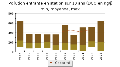 | Système de collecte : En 2023, le suivi départemental dans le cadre du programme NAIADE, a été réalisé par 1 bilan de performance sur 24 h le 29 mars et 1 visite avec analyses le 28 septembre. Description : Le réseau dassainissement dessert les communes du syndicat de la vallée de lEscou (Précilhon, Estos, Goes et un quartier dOloron sainte Marie) et la commune de Lédeuix. La collecte est de type séparatif pour le réseau du syndicat de lEscou et de type majoritairement unitaire pour la commune de Ledeuix. Certains tronçons sont anciens (centre-bourg). Deux déversoirs dorage principaux permettent de délester le flux par temps de pluie sur la partie unitaire de Lédeuix, un déversoir subsiste sur la partie Escou bien que le réseau soit séparatif. Le nombre dabonnés est denviron 1040. Fonctionnement : Selon lautosurveillance de 2023, - Le déversoir en tête de station (point A2), na jamais été actif au cours de cette année, alors quil létait un jour sur deux en 2022 (77 000 m3/an comptabilisés). - Les données des autres déversoirs ont été transmises pour les deux DO situé à laval des 2 réseaux de Ledeuix et du syndicat (DO Estos). Ce dernier est resté inactif toute lannée. Celui de Ledeuix a déversé (plus de10 m3/j) au cours de 183 jours pour un total déversé de près de 25 000 m3, 14% du flux collecté. Cé déversoir est ponctuellement actif en raison de laccumulation de déchets (à nettoyer très régulièrement). Cest le cas avant le démarrage de notre bilan de mars 2023. A noter que le déversoir se situant à Ledeuix près de la mairie déverse habituellement avant que celui-ci ne soit actif (pas de mesure en ce point). La personne chargée de lexploitation du réseau et de la station a indiqué lors du bilan de mars que les équipements de mesure sur les deux points A1 étaient défaillants. - Le flux parvenant à la station sur lannée a chuté de près de 30% : 147 000 m3/an en 2023 contre 214 000 m3/an en 2022. ? Le débit traité par temps sec, en période de nappe basse (1er juillet -31 octobre), est en moyenne de 191 m3/j (260 m3/j en 2022) ? La moyenne sur lannée toute météo confondue se situe à 402 m3/(590 m3/j en 2022). Pour notre bilan de mars 2023 (temps sec), on mesure 342 m3/j (DO Ledeuix, mairie Ledeuix et Estos, inactifs) soit 2280 EH hydrauliques avec un débit dECPP (approché par le débit minimal nocturne) de 216 m3/j soit 63% du débit à traiter. ? Si lon ne considère que les valeurs sur la période allant du 1er novembre au 30 avril, le débit alors collecté en moyenne augmente pour atteindre 510 m3/j toutes météos confondues. ? Par temps de pluie, en raison du caractère unitaire du réseau de Ledeuix, des valeurs importantes sont atteintes, jusquà 2250 m3/j (3000 m3/j en 2022) sous réserve que lappareillage en place puisse mesurer des valeurs aussi élevées. Cétait le cas pour notre bilan de temps de pluie en 2021 avec 1902 m3/j - 12 680 EH (sur la base de 1 EH = 150l/j). Le débit de pointe atteignait alors 100 m3/h pour un débit minimum de 61 m3/h. Flux polluant Selon lautosurveillance 2023, les concentrations de leffluent brut fluctuent en fonction de la saison et de la météo. Une valeur avec une DCO anormalement élevée est observée début mars (DCO = 1900 mg/l alors que la DBO est de 240 mg/l). Cette valeur écartée, la moyenne se situe à 770 EH, valeur faible au regard du nombre de raccordés. Le maximum à 2160 EH est mesuré pour notre bilan du 29 mars 2023, le ratio est alors de 2,1 EH/abonné (au-dessus de la moyenne en milieu rural qui se situe autour de 1,5 EH/abonné). Etudes et travaux Le réseau a été récemment réhabilité sur le territoire du syndicat. Afin de limiter le flux hydraulique en provenance de son réseau par temps de pluie, la commune de Ledeuix a entrepris en 2021 la réalisation de son schéma directeur de gestion des eaux pluviales (cabinet SEPIA conseil). Elle travaille maintenant à la séparation des eaux pluviales et des eaux usées (pas dinformation à notre niveau sur lavancée des travaux). |