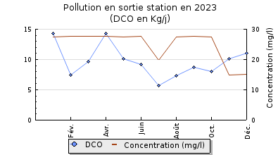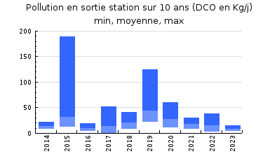 | DBO5 | 54 Kg/j | 24 % | 139 mg/l | 98 % | 1,0 Kg/j | 2,7 mg/l |