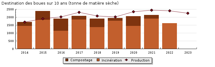 | Sous produits : Les boues en excès après centrifugation (3 centrifugeuses au total) et mise en benne sont soit incinérées sur le site de Lacq : four dédié aux boues issues de lépuration des eaux exploité par Véolia ; soit dirigées sur une plateforme de compostage. Lors de la visite NAIADE de mai 2023, la centrifugeuse n°2 était à larrêt , en attente du changement de la vis gaveuse. En 2023, un total de 2 244 T de matière sèche de boues ont été évacuées. En 2022, un total de 2 405 T de matière sèche de boues ont été évacuées. En 2021, un total de 2 129 T de matière sèche de boues ont été évacuées : 1 921 T pour incinération et 208 T pour compostage. En 2020, 2 338 tonnes de matières sèches de boues ont été traités. |