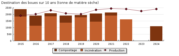 | Sous produits : Les boues sont à présent envoyées vers la filière de méthanisation. Elles sont pompées et tamisées avant dêtre envoyées dans une bâche appelée « Boues biologiques ». Un ajout de chlorure ferrique est effectué. Elles sont ensuite pressées à laide de 2 presses ANDRITZ (1 seule en service le jour de la visite). En sortie de la presse, les boues sont mélangées aux graisses dans la bâche appelée « Boues digérées » équipée de 2 pompes. Elles sont ensuite centrifugées (3 centrifugeuse en place dont une en service). Les boues sont dirigées vers le digesteur (équipé de 3 agitateurs) pour la production de gaz. Après plusieurs étapes de chauffage, les boues carbonisées transitent dans 1 économiseur. Elles sont ensuite stockées dans une cuve avant dêtre une nouvelle fois soit centrifugées soit pressées. En 2024, un total de 2 401 T de matière sèche de boues ont été évacuées. En 2023, un total de 2 244 T de matière sèche de boues ont été évacuées. En 2022, un total de 2 405 T de matière sèche de boues ont été évacuées. En 2021, un total de 2 129 T de matière sèche de boues ont été évacuées : 1 921 T pour incinération et 208 T pour compostage. En 2020, 2 338 tonnes de matières sèches de boues ont été traités. |