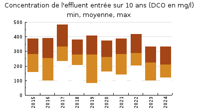 | Système de collecte : Le réseau collecte toutes les eaux usées de lagglomération paloise. Il est de type mixte. Les débits arrivant en tête de station sont importants notamment durant lhiver et les jours pluvieux. Daprès les mesures dautosurveillance de lexploitant, le débit moyen entrant (point A3) est denviron 60 140 m3/j et le débit maximum est de 115 640 m3/j le 18/10/2024 (8 mm de pluie ce jour-là et 28 mm de précipitations cumulées les 7 jours précédents). La capacité nominale hydraulique de la station à 106 590 m3/j est dépassée à 4 reprises au cours de lannée. Lors des forts débits (temps de pluie), une partie du flux arrivant nest pas traitée, un débit de by-pass est mesuré. Il comptabilise les effluents by passés en entrée station + le trop plein du bassin tampon. Ce by pass a été actif à 42 reprises dans lannée avec une moyenne de 400 m3/j et un maximum de 19 783 m3/j le 4 septembre 2024 avec 23 mm de pluie ce jour-là et 59 mm cumulés sur 7 jours. Le déversoir en tête de station est actif dès les 4 mm de pluies mesurés. Il a été actif pendant 139 jours dans lannée déversant environ 3,9 millions deaux brutes vers le bassin dorage. La moyenne des déversements est de 10 820 m3/j mais peut atteindre les 283 017 m3/j (le 11 mars 2024 avec 25 mm ce jour-là et 61 mm les 7 jours précédents). 15 % du volume arrivé à la station a transité par le déversoir d'orage. La station a traité dans lannée environ 22,01 millions de m3 deaux usées. Le débit moyen journalier mesuré en entrée de station toute météo confondue est denviron 60 140 m3 ce qui représente 56% de la capacité nominale hydraulique de la station et il descend à 27 520 m3 par temps sec le 6 février 2024. En moyenne, les eaux usées en entrée de station sont peu concentrées. Selon les données dautosurveillance 2024 de lexploitant , les flux de pollution organiques parvenant jusquà la station varient de 17 760 EH à 179 960 EH organiques (les flux sont calculés sur la DBO5 pondérée par la DCO). La moyenne de la charge entrante pour les 157 bilans complets réalisée en 2024 est denviron 80 050 EH soit 31 % de la capacité nominale organique de la station. En 2024, le suivi départemental a été réalisé par le biais dune visite avec analyses le 30 mai qui sest déroulée par temps humide. Dans ces conditions, le débit parvenant à la station était de 56 550 m3/j. |