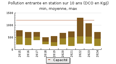 | Système de collecte : En 2024, le suivi départemental dans le cadre de NAIADE a été réalisé par une visite avec analyses le 14 mars par temps sec et par un bilan 24h le 7 octobre par temps humide (2 mm de précipitations=. Description : Le SA de Mourenx est composé dun réseau mixte de 40 km, de 8 postes de relevage dont : « Arenas » (Mourenx Bourg), « Des Lannes », « Frida Kahlo », « Citroën », 8 déversoirs dorage (DO) dont 4 équipés dune mesure de débit depuis 2017. Fonctionnement : Le réseau collecte massivement des eaux claires parasites permanente et est aussi très sensible à la pluviométrie ce qui occasionne des débordements via les DO dès les premiers millimètres de pluie. En 2024, à partir des données dautosurveillance (points A2, A3 et A4, pas de données communiquées sur les points A1), il est possible dindiquer que: - Point A2 : des déversements deffluents bruts supérieurs à 25 m3/j ont été constatés pour 279 jours (233 jours en 2023), représentant 756 888 m3 (596 000 m3 en 2023). Le maximum est de 10 892 m3/j (13 500 m3 en 2022) et 2 valeurs sont supérieures à 10 000 m3/j, sous réserve que ces valeurs soient compatibles avec la plage de mesure du débitmètre. - Le volume annuel traité par la station est de 773 020 m3/an (724 000 m3/an en 2023). Les déverses en A2 représentent 50% du volume amont station (A2 + A3), environ 1 555 540 m3/an ( 1 320 000 m3/an en 2022) soit une moyenne de lordre de 4250 m3/j (3600 m3/j en 2022). Le percentile 95 (2020-2024) est de 9810 m3/j. - Pour une pluie supérieure à 5 mm, quelle que soit la saison, le by-pass est quasiment actif de façon systématique. - Point A3 : le volume traité en moyenne correspond à la capacité de la station (2000 m3/j) et fluctue sur lannée entre 889 et 2994 m3/j. Les valeurs les plus faibles sont mesurées lété par temps sec. En période de nappe haute la durée de ressuyage est de plusieurs jours (4 à 7 jours). Sur lannée , il y a 93 jours pour lesquels les déversements au point A2 sont inférieurs à 50 m3/j. Pour le bilan NAIADE doctobre, qui sest déroulé par temps humide (2 mm), le débit collecté est élevé en raison des précipitations. De plus, compte tenu des pluies survenues il y a 2 jours, il est fort probable que le réseau soit encore en phase de ressuyage. Les déversoirs dorage sur le réseau sont restés inactifs durant la totalité du bilan. Cependant, le by-pass en entrée de station a été ponctuellement actif le 07/10/24, avec 63 m3 comptabilisés pendant le bilan. Dans ces conditions, le débit mesuré en entrée de station et admis en traitement sélève à 2292 m3/j et correspond à environ 15 277 habitants (EH) hydrauliques (sur la base 1 EH = 150 l/j). Ce volume est proche de celui mesuré lors de notre précédent bilan de mars 2023 dans les mêmes conditions (2377 m3/j). Compte tenu du caractère unitaire dune partie du réseau, par temps de pluie, les volumes appréhendés en amont de la station dépassent régulièrement 2 000 m3/j et témoignent de la grande sensibilité du réseau dassainissement aux évènements pluvieux. Flux polluant : Les échantillons prélevés en tête de station dans le cadre de lautosurveillance présentent des concentrations faibles voire très faibles, témoignant de la présence importante deaux claires parasites. Sur les 24 échantillons analysés en 2024, 1/3 présentent des concentrations comparables à celles requises pour un effluent traité de bonne qualité. La charge moyenne mesurée en entrée de station en absence de by-pass est de 3800 EH (4610 EH en 2022), le maximum se situe à 6795 EH et le minimum à 837 EH. Si lon assimile les concentrations de leffluent by-passé à celles de léchantillon entrée station, la charge en amont du dernier DO fluctue entre 160 EH et 10085 EH (une valeur à 19 300 EH a été écartée, car peu réaliste) La moyenne se situe à 2449 EH (4760 EH en 2023). Pour le bilan NAIADE doctobre ; la charge organique est de 2 600EH. |