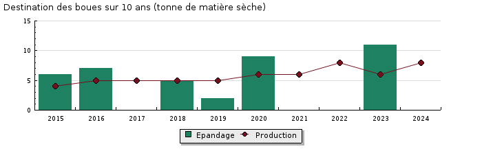 | Sous produits : Depuis le printemps 2014, la station dispose dune bâche souple de 240 m3 pour stocker les boues sur une longue durée, permettant plus de souplesse dans la gestion des boues en excès. Une vidange complète de la bâche a été effectuée en février 2020 avant la déclaration de crise sanitaire COVID 19. Lexploitant déclare une production denviron - 7,6 tonnes de MS pour 2022 - 5,8 TMS pour 2023. - 7,7 TMS en 2024 La quantité de boues évacues en 2023 serait de 2,75 TMS en mai (250 m3 correspondant à une vidange complète de la bâche). Pas de nouvelle vidange de la bâche en 2024. La pompe qui permet le brassage des boues de la bâche de stockage des boues ne fonctionne plus. |