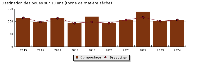 | Sous produits : Les boues sont pompées dans le puits de recyclage à laide dune pompe spécifique. Elles sont traitées à l'aide d'une centrifugeuse de type ALFA LAVAL ALDEC G2-40. Les boues déshydratées sont stockées en bennes avant dêtre acheminées vers une plate-forme de compostage (Bonnut ou Saint Girons) Pour 2024, la production annuelle est de 106 T de matières sèches. Pour 2023, la production annuelle est de 101,9 T de matières sèches. Pour 2022, la production annuelle est de 116,2T de matières sèches. En 2021, 506 tonnes de boues à 21% de siccité soit 106 tonnes de matières sèches ont été évacuées. Pour 2020, 448 Tonnes de boues brutes ont été évacuées. |