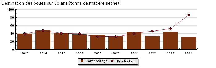 | Sous produits : Une Adéquapress équipée de 2 vis permet de traiter les boues par ajout de polymère. Les boues sont stockées dans des bennes et évacuées par un transporteur vers un centre de compostage (Filière Véolia) à Bonnut (64). Une des 2 vis est déposée (axe central voilé avec frottement de la vis sur la maille). Le rendement de louvrage est impacté depuis février 2022. Pour 2024, 31 tonnes de matières sèches de boues ont été évacuées après traitement, soit la production de 2100 EH. Pour 2023, 43 tonnes MS qui ont été évacuées, correspondant à la production de boues attendue pour 2900 EH. Pour 2022, 46 tonnes MS qui ont été traitées, correspondant à la production de boues attendue pour 3170 EH. Entre janvier et octobre 2021, 237 tonnes de boues ont été évacuées pour compostage (Bonnut). En début 2020, le préposé a rencontré des difficultés pour extraire les boues suite à différentes pannes qui impactent le traitement des boues (préparation polymère, pompe eau industrielle, agitateur silo). Le silo a été vidé le 11/06/20 par une société dhydrocurage pour permettre à lagent dintervenir sur lagitateur du silo. En 2020, 32.5 tonnes de matières sèches de boues ont été évacuées après traitement vers Bonnut. Pour 2019, 36 tonnes de MS ont été évacuées, soit la production de 2400 EH. |