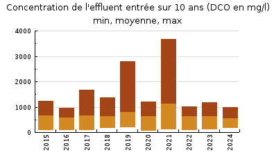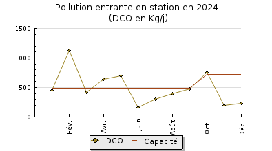 | Système de collecte : Le réseau dassainissement dessert les communes de Poey de Lescar (813 abonné), Aussevielle (333 abonnés) et Siros (Données RPQS 2023). La collecte des eaux usées domestiques est du type séparatif. Le linéaire est assez long, des extensions par antenne seffectuent pour desservir des habitations neuves (lotissements par exemple). En 2024, le suivi départemental a été réalisé par le biais d dun bilan 24h le 23 mai par temps sec mais après de fortes pluies les jours précédents et dune visite avec analyses le 22 octobre par temps sec. Daprès les résultats de lautosurveillance de 2024, - le flux traité en moyenne est de 945 m3/j (857 m3/j en 2023), toutes conditions météorologiques confondues. Par temps sec, cette moyenne chute à 704 m3/j (644 m3/j en 2023). - Pour la période entre le 1er juin et le 31 octobre, la moyenne journalière chute à environ 721 m3/j (toute météo confondue), cependant sur la période allant du 1er novembre au 31 mars, la moyenne journalière est de 1183 m3/j. La capacité de la station (1 000 m3/j) est dépassée pour 104 jours. En plus de la pluviométrie, le ressuyage influe fortement sur le flux hydraulique collecté. - Le déversoir dorage en A2 est peu actif, on dénombre 17 déversements en 2024 (entre 2 et un maximum de 2470 m3/j le 20 juin ). - le flux maximal collecté atteint 4 342 m3/j le 3 mars 2024 au cours dune période pluvieuse 17,5 mm et 58 mm cumulés sur les 7 jours précédents. - en 2024, la station a traité environ 345 820 m3/an. (312 685 m3/an en 2023). Les déversements en A2 représentent 3,8% de ce volume entrant. - le percentile 95 est de 2 457 m3/j sur les 5 dernières années Du point de vue de la charge organique, elle fluctue énormément de 1299 EH en décembre à 5150 EH en février. Le point de prélèvement en entrée nest pas optimal et les charges supérieures à 3000 EH ne sont pas représentatives de la pollution domestique raccordée. Lors du bilan NAIADE du 23 mai, réalisé par temps sec, les postes Poey-de-Lescar, Palanque, Ossau et Clos de la rivière ont correctement fonctionné pendant le bilan 24h. Au niveau du poste « Clos de la rivière », il est conseillé de remettre en fonctionnement la pompe n°2. Il ny a pas eu de déversement au niveau du déversoir « Entrée station ». 960 m3 ont été mesuré par le débitmètre poste fixe « Entrée station », ce qui correspond à 6 400 EH (sur la base de 1 EH = 150 l/j). Les concentrations de leffluent brut sont caractéristiques dun effluent domestique très dilué (DCO = 285 mg/L). La charge organique à traiter correspond à 1 860 EH (DBO5 pondérée par la DCO, sur la base 1 EH = 60g de DBO5 et 1 EH = 120g de DCO). Daprès les données dautosurveillance 2024, la DCO moyenne avec 12 mesures dautosurveillance est de 590 mg/l, toute météo confondue. |