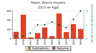 | Station d'épuration : Un bassin dorage en tête de station permet décrêter les surplus de débit occasionnés par la pluie. Ainsi, la filière biologique est protégée hydrauliquement. Bonne fiabilité des équipements. Au cours du bilan NAIADE de mai 2024, la station a fonctionné avec les taux de charge suivants : Hydraulique : 94 % (sur létage biologique). Selon les valeurs dautosurveillance le taux de remplissage hydraulique varie de 11 % à 349 % (valeur maximale atteinte le 20 juin 2024 avec 37 mm de précipitation) avec une valeur moyenne de 59%. Organique : environ 24% (DCO pondérée par DBO5). Pour les mesures dautosurveillance de 2024, le taux de charge varie de 22 à 86 % avec une valeur moyenne de 49% Lors du bilan NAIADE de mai 2024, le taux de boues en aération est faible (MES = 1,9 g/l). Il est conseillé de maintenir dans le bassin daération un taux de boues entre 3 et 4 g/l. Les boues présentent une bonne aptitude à la décantation (Indice de boues = 105 ml/g MES). Le suivi de loxygène dissous effectué dans le bassin montre un bon fonctionnement de laération. Les surpresseurs fonctionnent correctement sur sonde rédox. Les vitesses ascensionnelles en clarification sont favorables à la décantation avec des valeurs de lordre de 0,23 m/h pour le débit moyen et le débit de pointe. Les rendements épuratoires sont très satisfaisants sur lensemble des paramètres compte tenu de la dilution des effluents bruts. Labattement sur le phosphore atteint 50 % sans le dispositif dinjection de chlorure ferrique à larrêt. Selon les données dautosurveillance de lannée 2024, les rendements épuratoires sont satisfaisants (supérieurs à 93 %) sur DCO, DBO5 et MES. La nitrification est satisfaisante avec un rendement sur lazote global de 93 %. Labattement sur le phosphore est en moyenne de 66%. Pour toutes les mesures dautosurveillance 2024 ainsi que pour les deux mesures NAIADE, l effluent traité est de bonne qualité. Lors du bilan NAIADE de mai 2024, le rendement énergétique est largement défavorable (8 kWh/kg de DBO5 éliminé). |
