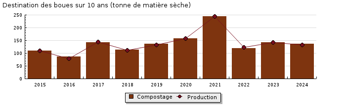 | Sous produits : Les boues sont déshydratées puis acheminées en centre de compostage du groupe Terralys. Pour lannée 2021, cela représente 756 tonnes de boues brutes (poids bennes), soit 243 tonnes de matières sèches. Pour lannée 2022, 13 483 m3 de boues liquides ont été produites (concentration moyenne de 9 g/l) 595 tonnes de boues brutes ont été évacuées par bennes, soit 119 tonnes de matières sèches Pour lannée 2023, 19 813 m3 de boues liquides ont été produites (concentration moyenne de 7.3 g/l) 715 tonnes de boues brutes ont été évacuées par bennes, soit 142 tonnes de matières sèches Pour lannée 2024, 17 200 m3 de boues liquides ont été produites (concentration moyenne de 7.7 g/l) 682 tonnes de boues brutes ont été évacuées par bennes vers le centre compostage de Bellocq, soit 137 tonnes de matières sèches (siccité moyenne de 20%). |