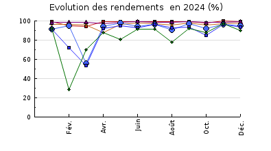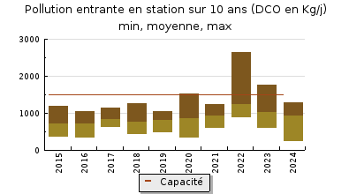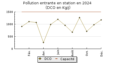 | Station d'épuration : Description : Il sagit dune station à boues activées dune capacité de 13 200 EH. Les effluents subissent tout dabord une étape de prétraitement comprenant un dégrilleur à escalier (installé en 2023 ; le tamis auparavant en place a été enlevé) et un dégraisseur-dessableur. Le traitement biologique se fait dans le bassin daération comprenant une zone de contact (mélange des eaux brutes, des matières de vidange dépotées, des boues recirculées et des eaux de colature), dune zone anaérobie et de la zone aérée. La zone aérée comprend 2 agitateurs et 3 surpresseurs. Une injection de chlorure ferrique permet de traiter le phosphore. Puis les phases eau/boues sont séparées au niveau du clarificateur. Les effluents subissent ensuite un traitement tertiaire de désinfection comprenant au préalable filtration par tamis rotatif (élimination des MES) puis un passage dans un réacteur de lampes UV. La station est également équipée dune unité de dépotage des matières de vidange. By-pass en tête de station (point A2) Après concertation avec la DDTM et lagence de leau, les déversements à lentrée de la station dépuration (DO au niveau du poste de relevage) sont, depuis le 1e janvier 2023, assimilés au point A2 et non plus au point A5. On note 13 journées au cours desquelles ce by-pass a été actif. Les volumes déversés en ce point représentent en 2024 3% du flux global parvenu à la station. Taux de remplissage de la station (point A3) - Hydraulique : La station dépuration fonctionne par temps sec avec un taux de charge hydraulique variant de 40 à 60% voire davantage en phase de ressuyage de réseau. Par temps de pluie la capacité de la station peut être dépassée (à 52 reprises en 2024). Le taux de charge hydraulique moyen sur lannée est de 71%, toute météo confondue (70% en 2023 ; 63% en 2022). - Organique : Le taux de charge organique, évalué sur la DBO5, varie de 8 à 60%, avec un taux moyen annuel de 37% (35% en 2023) Fonctionnement : La gestion et lentretien de la station sont sérieux. Le surpresseur 1 a été remplacé le 19/04/2024 ainsi que les diffuseurs du bassin daération. Le surpresseur 2 est à larrêt, en attente de réparation. Les agitateurs de la zone de contact, de la zone anaérobie et un des agitateurs de la zone anoxie, à larrêt lors de notre précédente visite (23/11/2023), ont été remis en service en avril 2024. Lors de notre visite du 1 er octobre, le fonctionnement général de lunité de traitement et des postes de relevage présents sur le réseau est satisfaisant. Le taux de boues en aération est correct (4,06 g/l). Les boues présentent une aptitude satisfaisante à la décantation (IB = 98,5 ml/g MES). La gestion et lentretien de la station sont sérieux. Performances : Les données dautosurveillance de lexploitant indiquent une bonne qualité de rejet tout au long de lannée sur lensemble des paramètres carbonés (DCO, DBO5), les matières en suspension. Les performances sur lazote sont également élevées, le résiduel dammonium NH4 varie de 1 à 7 mg/l (moyenne : 2.6 mg/l) ; la concentration en azote global NGL varie de 2 à 11 mg/l (moyenne : 4.7 mg/l). La concentration en phosphore dans le rejet varie de 0.2 à 1.6 g/l. Les performances épuratoires sur le système dassainissement sont supérieures à 92% sur lensemble des paramètres sauf le phosphore (86%). Lors de notre visite du 1er octobre, le rejet est également de bonne qualité. Les effluents subissent également un traitement tertiaire de désinfection par ultra-Violet. |