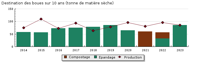 | Sous produits : La station dispose d'un silo de stockage équipé d'un agitateur. Il est alimenté automatiquement 40 min/jour à partir de 10h30. Les boues sont déshydratées par un système de presse à bandes. Les boues pressées sont entreposées sur une aire de stockage située aux abords immédiats de la station. Elles sont habituellement recyclées en agriculture, le plus souvent au printemps (situation antérieure à la crise Covid de 2020). Pour lannée 2020, 96 tonnes de matières sèches ont été évacués Pour lannée 2021 : - 300 m3 de boues ont été évacuées par SUEZ en centre de compostage (Bellocq et Pontacq) sur la période du 11 au 14 mars 2021. - Entre début janvier et le 13 octobre, 7 041 m3 de boues liquides ont été pressées avant stockage. Pour lannée 2022, 96 tonnes de matières sèches ont été évacuées vers les sites de compostage SUEZ : Pontacq et Bellocq. Pour lannée 2023, 85 tonnes de matières sèches ont été produites et stockées dans le hangar. Elles ont été par la suite recyclées en agriculture mais nous navons pas les quantités épandues |