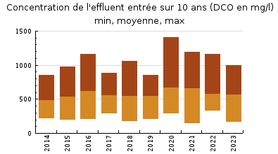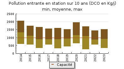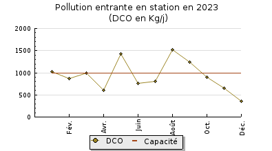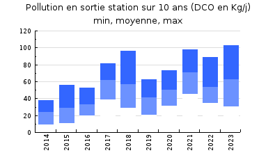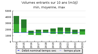| Système de collecte : En 2023, dans le cadre du programme Naiade, un bilan de performances sur 24 heures le 6 mars par temps sec et une visite avec analyses le 12 octobre ont été réalisés. Etude en cours : Dans le cadre du projet de reconstruction de la station dépuration par lAgglomération Pays basque, une étude avec réalisation de pollutogrammes a été réalisée en 2021 pour caractériser limpact des évènements pluvieux sur la nature et la composition des effluents bruts. Le schéma directeur dassainissement couplé à un schéma pluvial a également été au début de lannée 2023. Malgré des travaux importants entrepris il y a 10 ans, les débits journaliers sont presque toujours supérieurs à la capacité hydraulique de la station (1 500 m3/j). Le DO en tête de station fonctionne très régulièrement, il a été actif 304 jours en 2023 (238 jours en 2022 ; 232 jours en 2021). Le by-pass en ce point représente en 2023 environ 46% du flux total sous réserve que les valeurs transmises par cet appareil soient correctes. L'effluent by-passé en ce point transite par un décanteur lamellaire avant rejet au Saison. Le réseau collecte énormément deaux claires parasites permanentes. Les travaux de réhabilitation par lintérieur effectué avant 2015 semblent perdre de leur efficacité au fil du temps, les eaux parasites parviennent vraisemblablement à sinfiltrer en dautres points du réseau. Débits et flux de pollution : Pour lannée 2023, à partir des données dautosurveillance de lexploitant, sous réserve que les valeurs de by-pass soient justes : ? le volume deffluents parvenus à la station (points A3+A2) varie de 1 024 à 11 223 m3/j, toute condition de nappe et de météo confondues (885 à 10 600 m3/j en 2022 ; 1000 à 9000 m3/j en 2021). Le débit moyen journalier collecté est de 3 177 m3/j. ? le percentile 95 des débits entrants (A3+A2) est de 7 038 m3/j sur les 5 dernières années (7 044 m3/j en 2022) ? On totalise sur lannée environ 1,1 millions deffluents collectés : 614 000 m3 traités par la station et 524 000 m3 déversés à lentrée de la station (point A2) ? le volume deffluents traités par la station varie de 836 à 2621 m3/j, avec une moyenne de 1 682 m3/j (850 à 2490 m3/j en 2022; de 1000 à 2650 m3/j en 2021). - Malgré les eaux claires parasites, leffluent brut est normalement concentré (DCO de 566 à 1 363 mg/l) ; dilué par temps de pluie ou en période de ressuyage (DCO de 170 à 600 mg/l). La moyenne en DCO sur lannée est de 566 mg/l, toute condition confondue. - les flux de pollution traités par la station, évalués à partir de la DBO5 pondérée par la DCO varient de 2 400 EH à 12 000 EH organiques, avec une moyenne de 7 000 EH organiques. Au cours de notre bilan 24H du 6 mars 2023 par temps sec : Les principaux postes de relevage sur le réseau ont correctement fonctionné. Les trop-pleins au niveau des postes « Baragarry », « Les Pyrénées », « Abense » sont restés inactifs ainsi que pour le DO « abattoir ». Le by-pass en amont de la station a été actif : 125 m3 acheminés vers le décanteur lamellaire avant rejet au Saison. Le volume traité sur la filière biologique, régulé par vannage par lexploitant, est de 1 443 m3/j ; il est en adéquation avec ceux habituellement mesurés. Lhistogramme des débits horaires est représentatif des rejets domestiques avec des débits de pointe horaires de lordre de 70 à 75 m3/h. Le régime minimal nocturne sétablit à 42 m3/h, témoignant de limportante collecte deaux claires parasites Leffluent est normalement concentré (DCO = 657 mg/L). La charge organique correspond à 6 717 EH. Elle est identique à celle mesurée lors du précédent bilan du mois de juin 2022. Il sagit de la seconde fois consécutive où la charge mesurée est plus élevée que les valeurs usuellement rencontrées (4000 à 6000 EH organiques). Les variations de charges dactivités de labattoir peuvent expliquer ces surcroîts de charges. |