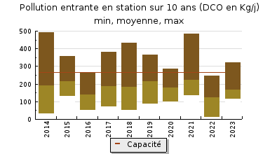 | Système de collecte : Cette station a traité environ 186 m3/j (moyenne des débits en entrée sur 6 mois) soit 56% de sa capacité nominale (330 m3/j). De plus, du by-pass est souvent observé dès qu'il pleut et que le niveau du cours d'eau à proximité monte. |