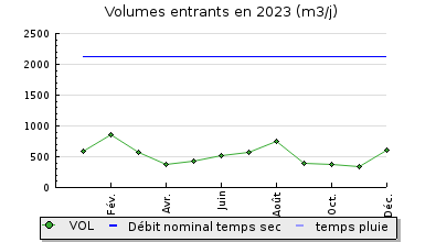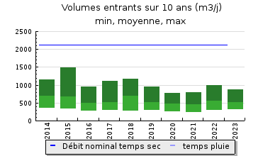 | Système de collecte : Dimensionnée pour traiter 2100 m3/j (haute saison), elle en a reçu 553 m3/j (moyenne des débits eaux brutes sur 12 mois) soit 26% de sa capacité nominale. En haute saison touristique, environ 1000 m3/j arrivent à la station. Beaucoup d'eaux claires arrivent à la station en période hivernale. |
