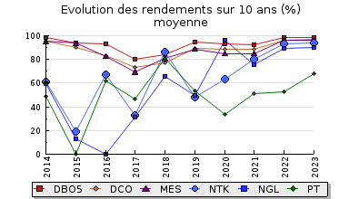 | DBO5 | 135 Kg/j | 31 % | 236 mg/l | 98 % | 2,1 Kg/j | 3,1 mg/l |