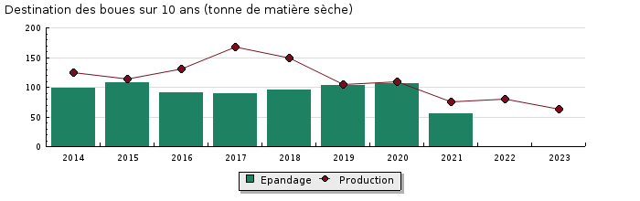 | Sous produits : Les boues sont stockées 1 an dans un hangar, puis chaulées dans l'attente d'un épandage agricole une fois/an. Le dernier épandage a eu lieu en mars 2022. Il est réalisé par Labat Assainissement. Les graisses sont évacuées quatre fois par an l'entreprise Labat Assainissement d'Aire sur Adour. |