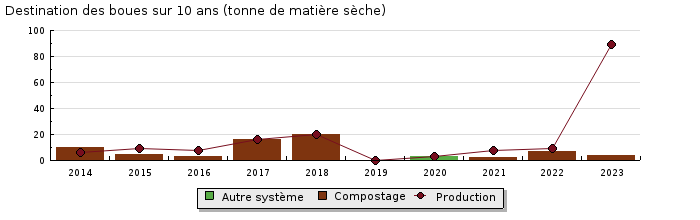 | Sous produits : Les boues de fond de clarificateur sont stockées dans un silo épaississeur de 160 m³, puis déshydratées sur un filtre presse à bandes et stockées dans une benne. Elles sont ensuite acheminées et traitées au centre de compostage de la Coved à St Sulpice dans le Tarn. Des analyses de boues sont réalisées en sortie du silo (avant injection sur le filtre presse à bandes) et un débitmètre électromagnétique est installé sur cette même conduite, permettant ainsi de quantifier les volumes et les concentrations des boues extraites du silo. Les volumes extraits déclarés par l'exploitant ne sont pas cohérents avec la charge de pollution éliminée. La fréquence d'extraction des boues est d'1 à 2 fois / semaine . La fréquence est adaptée à la charge de pollution à traiter en fonction des résultas d'analyses de concentration des boues activées et des tests V30. Cependant la concentration de boues dans le bassin activée est toujours trop importante et doit être ramenée à 2 à 3g/l pour assurer un bon traitement, une bonne décantation et éviter des départs de boues au ruisseau. La presse a été réparée en 2020 : les tapis, les paliers, les roulements, le convoyeur et les rouleaux ont été remplacés. Les refus de dégrillage et graisses sont régulièrement évacués (2 fois/an) par la société "Assainissement 81" et acheminés vers les centres de traitement adaptés. Les sables ne peuvent plus être extraits par la présence d'un furêt coincé dans la canalisation d'extraction. |