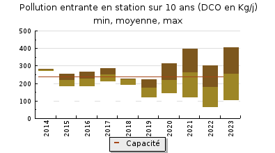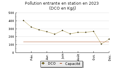 | Système de collecte : Le réseau de type séparatif, comporte 7 postes de relevage dont un général pour le bourg et un pour la base de loisirs, qui alimentent directement la station avec chacun un refoulement de 2 kilomètres. En 2020, on dénombrait 853 raccordements au réseau d'assainissement soit environ 1500 personnes (à 1,8 personnes par raccordement). Un diagnostic de réseau a été réalisé. Il ressort des investigations : - un linéaire de 21,5 km, avec 7 postes de refoulement - un réseau gravitaire majoritairement en D200 mm et quelques réseaux en D150 mm dans le centre-ville - Un Déversoir d'Orage en amont du PR la Gravette, qui est en mauvais état et qui déverse régulièrement par temps de pluie - Des Eaux Claires Parasites Permanentes estimées à 108 m3/j soit 45% d'ECPP - Une surface active totale de 13 040 m² 12 autosurveillances réglementaires ont été réalisées en 2023 par l'exploitant, avec 4 complètes et 8 partielles. La charge organique moyenne reçue lors des autosurveillances a été de 2395 EH, soit 123% de la capacité nominale de la station (calculé à partir de la DBO, DCO, NTK et Pt). Pour 2023, la charge de DBO moyenne a été de 2850 EH et la charge de DBO maximale a été de 6983 EH. Ces valeurs élevées sont liées à des concentrations en entrée très élevées pour les autosurveillances de juin, juillet et août (2 à 3 fois supérieures aux normales sur des périodes de temps sec). Il y a surement eu un problème sur les prélèvements (mauvais emplacement de la crépine ?) La charge hydraulique de 2023 est de 1 999 EH. L'exploitation du fichier Sandre 2023 fait ressortir : - un débit moyen entrant de 300 m³/j, soit 91% de la capacité nominale de la station. - un débit maximum de 748 m³/j (suite à de forts épisodes pluvieux en novembre) - une estimation de la surface active de 9 000 m² - Une estimation des Eaux Claires Parasites Permanentes (ECPP) impossible du fait de l'absence de nappe haute en 2023. Les surfaces actives sont sûrement sous estimées car il n'y a pas de point de mesure sur le DO des Gravettes en 2023. |